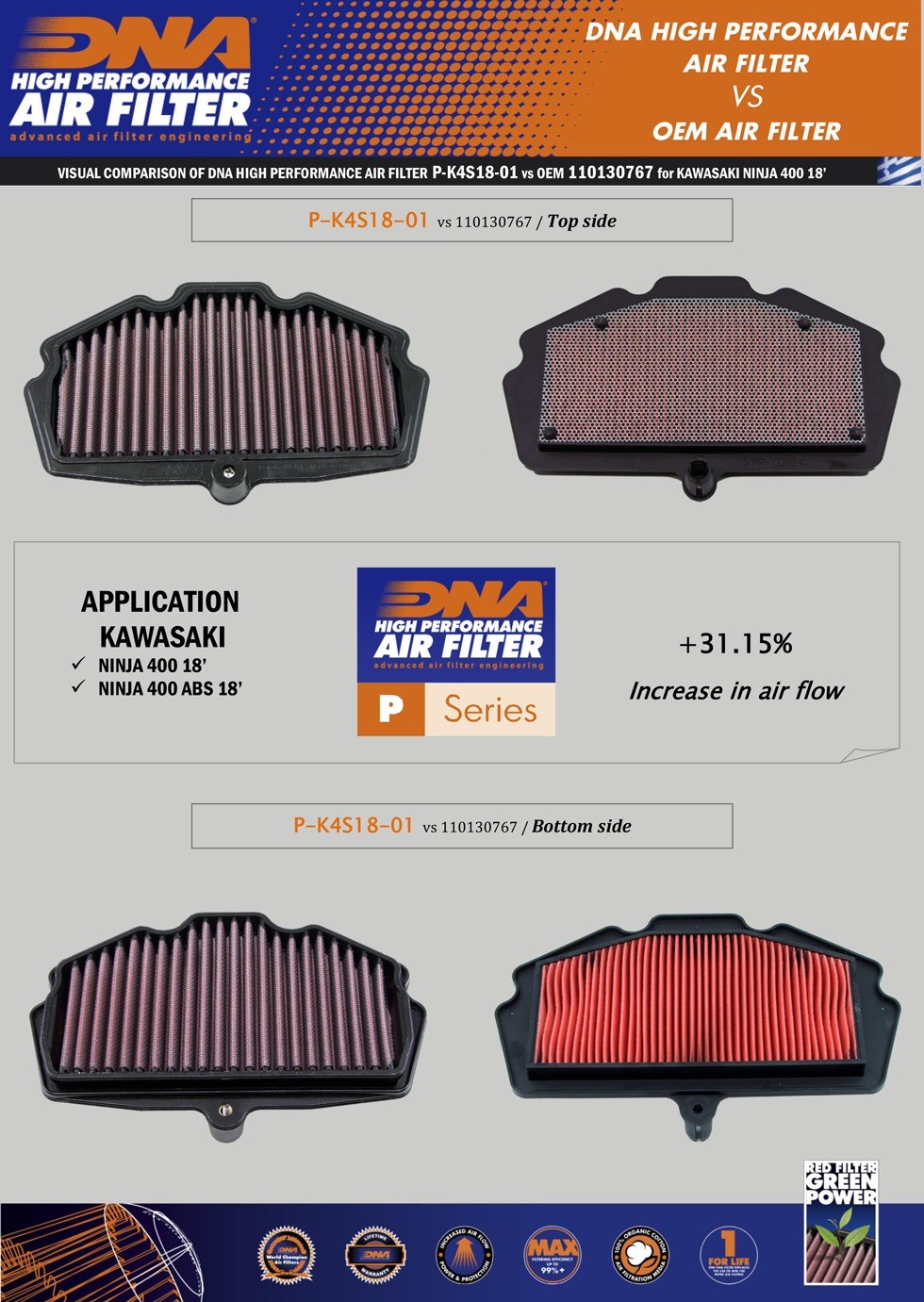 CA Emissions Info Shipping Contact Us Item Availability Returns IMPORTANT CALIFORNIA SPECIFIC EMISSIONS NOTICE California laws prohibit (in most cases) the use of any aftermarket product whose installation requires the removal of any emissions control related components as regulated by the California Air Resources Board. Three classification levels of emissions related aftermarket products define which aftermarket parts can be sold legally in the state of California: Replacement Parts parts that have the same function and affect on emissions as the parts they are replacing. This means that if a vehicle was not originally equipped with a catalyst and all other emissions related controls that were connected (such as oxygen sensors) are reconnected, then the part is considered a Replacement Part. If the vehicle has a catalyst and the installation of the part does not remove the catalyst, and all other emissions related controls are reconnected, then this is considered a replacement part. Slip on mufflers in applications whereby the catalyst is not contained in the original muffler is an example of a replacement part. Full exhaust systems installed on vehicles that did not originally contain a catalyst and whereby the design allows the reinstallation and original function of any other emissions control related components are also considered replacement parts. Modified Parts parts that alter the emissions control related performance from the original part they are replacing, These parts may have catalysts in them but they perform differently from the original equipment part or they may require the alteration or elimination of other emissions related control components such as oxygen sensors. These parts must obtain an Executive Order ("EO") from the California Air Resource Board (C.A.R.B.) to confirm their functional compliance in order to be sold legally in California. Competition or Racing Vehicle Parts parts that are used exclusively in competition on race only vehicles. These parts do not require approval as long as they "are not used on public highways". Labeling a product as being for "Racing Only" or "Closed Course Competition" is not sufficient for it to be included under this classification. It must be a competition vehicle and must not be used at any time on a public highway. Many exhaust systems, intake kits, fuel tuners, and performance parts we sell are specifically designed and designated as/for "Competition and Racing Vehicles Only". Any/All model application pictures shown are for reference only and solely intended for Competition and Racing Vehicles only and must not be used at any time on a public road/highway. If an item is designated as "Competition and Racing Vehicles Only", we will require a race waiver be digitally signed before an item can ship to California. If an item is to be exported from California, an export waiver is available as well. This is a REQUIRED guarantee from you that a restricted item will NOT be used on any public highway in California; only on private race tracks in racing or competition use. Many "Modified Parts" are sold with out restriction in California and will be identified with a C.A.R.B. "EO" number and will arrive with appropriate labels to indicate the approved status. If you're not sure about the California emissions status of an item, please contact us for clarification before placing your order Check the shipping calculator for estimated shipping costs. If your location isn't shown, or shipping cannot be calculated for your location, please contact us for a shipping price. International buyers are responsible for duty and VAT charges. We do not collect those fees, we do not have control over them, nor do we know how much they will be for any given country. Our retail/internet/mail order warehouse is in the Gorman, California area between Los Angeles and Bakersfield. All items are available for local pick up, but please contact us to make arrangements before hand. Some high-value items will require signature for delivery. Open 7 Days A Week! Mon.-Sat. - 8am-5pm PST Sunday - 8am-Noon PST Contact us through ebay. Click "Ask a question" at the bottom of the description. Please check the estimated delivery date shown in the shipping tab, these are updated daily based on current inventory across all of our warehouses. We always try to meet or beat these stated delivery times. Some items are made to order and can have longer lead times; check the shipping details for an estimate. Please contact us for expedited shipping options if needed. All exchanges and returns must be in the original packaging, with all directions & accessories, in new condition. Please contact us with any questions. P-K4S18-01 Product Details: OEM Air Filter Air Flow: 122.00 CFM DNA Air Filter Air Flow: 160.00 CFM DNA Increased Air Flow: 31.15% DNA Filtering Efficiency: 98-99% This filter features DNA's advanced FCd (Full Contour design). Installation of the filter is very easy, simply follow the information that can be found in the Kawasaki workshop manual. The filtering efficiency is extremely high at 98-99% filtering efficiency, with 4 layers of DNA Cotton. The flow of this DNA Fcd filter is very high, 31.15% more than the Kawasaki stock paper filter! DNA Fcd air filter flow: 160.00 CFM (Cubic feet per minute) @1.5"H2O corrected @ 25degrees Celsius. Kawasaki stock paper filter: 122.00 CFM(Cubic feet per minute) @1.5"H2O corrected @ 25degrees Celsius. This DNA filter is designed as a High flow filter for road use. Fits the following vehicles type years make model engine required location notes Motorcycle 20-23 Kawasaki Ninja 400 399 1 Motorcycle 18-23 Kawasaki Ninja 400 ABS 399 1 Motorcycle 18-23 Kawasaki Ninja 400 KRT Edition 399 1 Motorcycle 19-22 Kawasaki Z400 ABS 399 1 Unless stated otherwise, these vehicle compatibilities are based on USA models with original equipment. Thanks for shopping with us ! Starcycle USA has been serving the world's motorcyclists since 196
