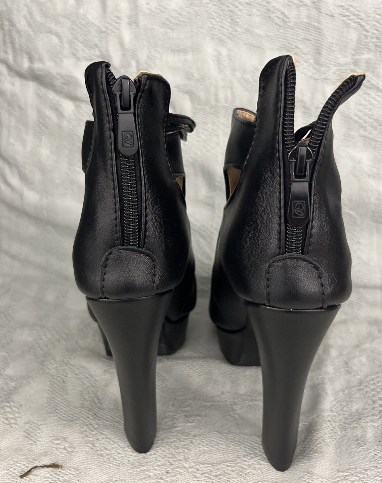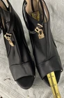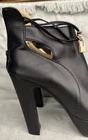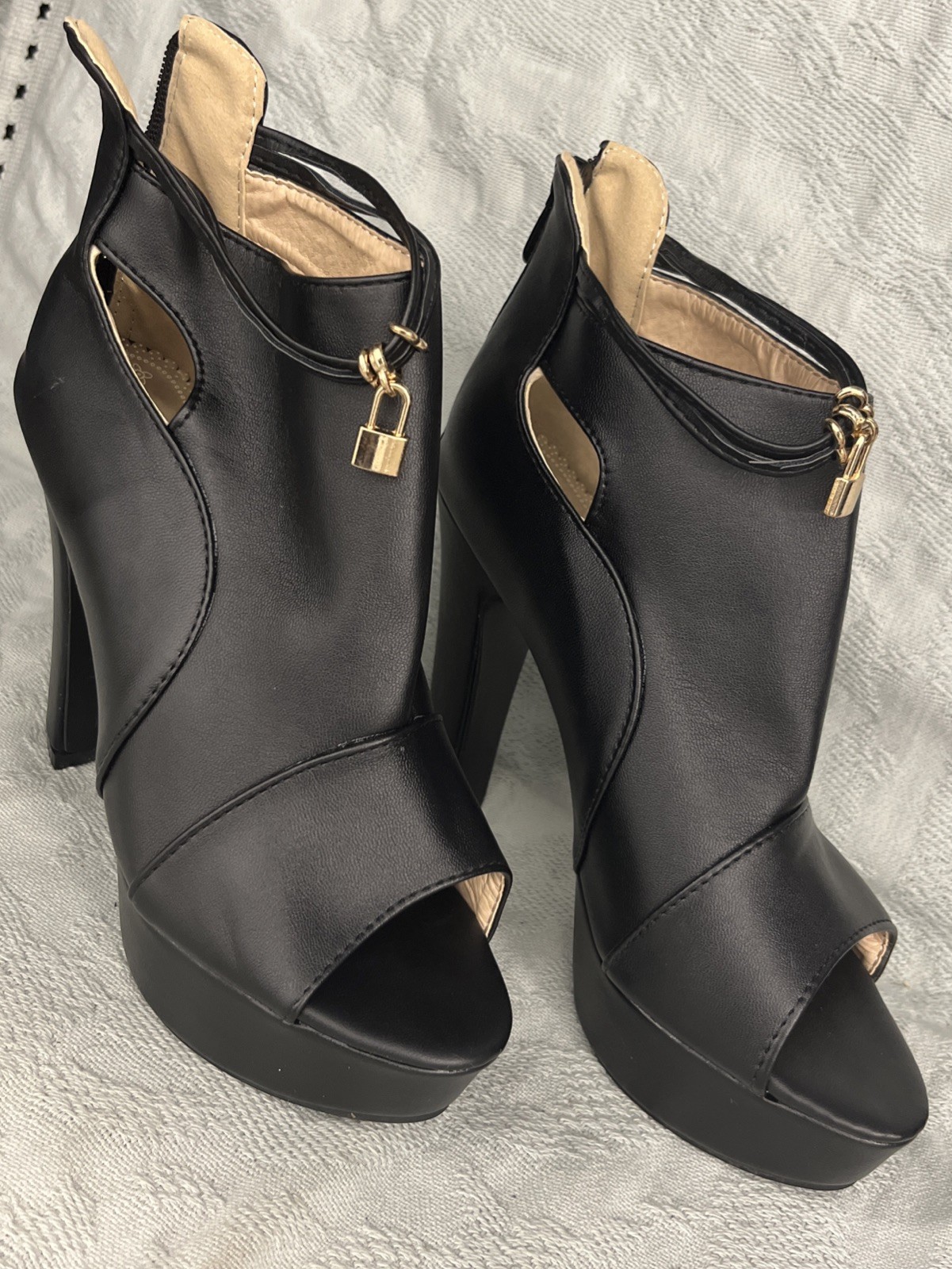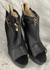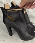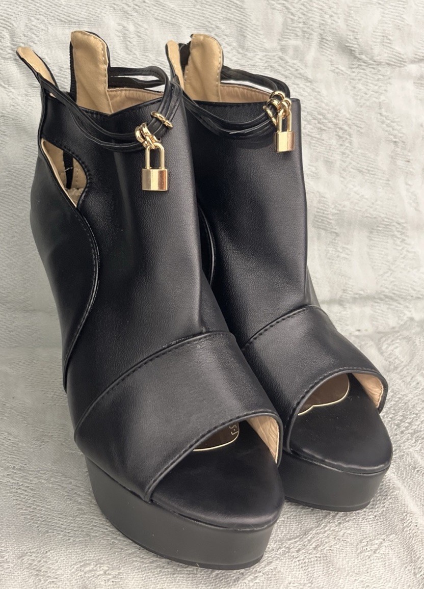 See pics for measurements These black high heel booties in size 6.5/7 feature a peep toe design, zipper back closure, and ankle band with lock. ( see pics) The ultra high block heel adds a stylish and trendy touch to the booties, making them perfect for parties, cocktails, or business events. Made from faux leather with a fabric lining, these lightweight boots are a limited edition addition to any woman's wardrobe. The ankle bracelet accent and side slits add a unique flair to these ankle boots, making them a coveted choice for fashion-forward women. Clothes box 2. Unit