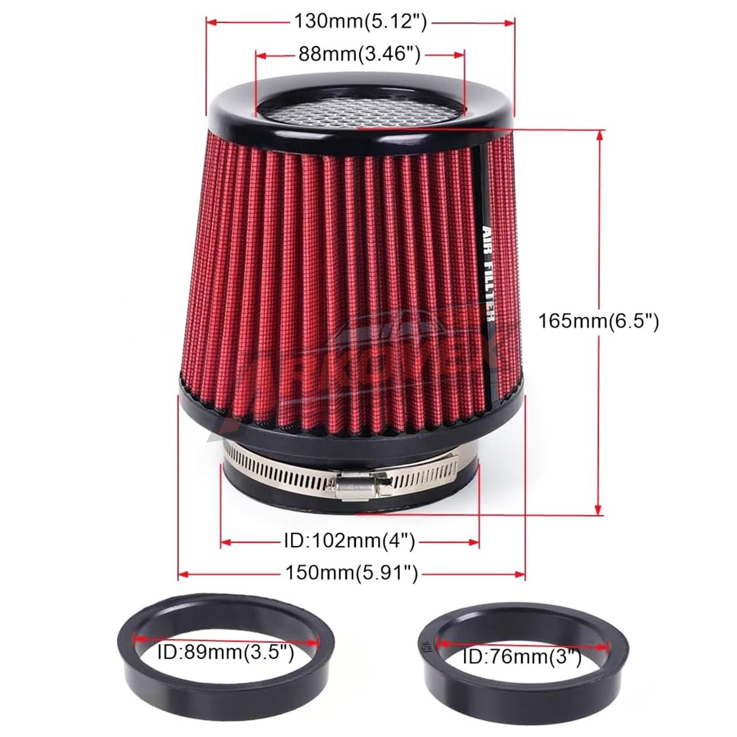 3" 3.5" 4" Inlet Car Replacement Cold Air Intake Filter 76mm 89mm 102mm 3 Sizes in 1 High Flow Performance Cone Air Filter (Red) Using a washable, reusable product helps reduce replacement waste. Comes with three different adapters for three sizes 76MM/3"、 89MM/ 3.5"、102MM/4" , shapes for most applications. Pushing the limits of engine protection by protecting your engine from harmful contaminants. State-of-the-art filtration media provides up more airflow than disposable paper filters to increase power and acceleration. Fitment:Air Filter Comes with three different size inlet 3"(76mm),3.5"(89mm),4" (100mm) for most air inlet system,meet the demands of all kinds of automobiles. Design:The overall conical shape, the deep pleats on the sides and the hexagonal honeycomb mesh design at the top increase in air contact area and increase inspiratory volume. Material:The top is thickened sponge filter, the side is made of a three-layer synthetic filter fabric non-woven fabric.Quality materials used throughout including washable, oiled synthetic media, urethane, and steel mesh.This cold air inatke will be easier, and reduce the suction load on the engine. Performance:Dry air filter offers can be reused after cleaning.The reusable nature of this filter helps reduce waste and contributes to a more sustainable vehicle maintenance routine. Cold Air Intake Filter dirt and protects your engine from harmful contaminants. Installation:Cold air intake filter designed with a simple clamp-on mechanism,the cone air filter includes two adapters (3 and 3.5 inches).You can easily complete the installation without complicated tools.This ensures easy installation and a perfect fit for your vehicle.