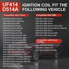 8Pack Ignition Coil and Spark Plug+Wire For GMC Chevy Silverado 1500 Tahoe 5.3L Item Description 【NOTE】 --There are 2 different type of coils the round body coil UF414/D514A and the Square body coil UF413/D510C , which may cause misunderstandings on your part, causing you to make the wrong choice unintentionally.Please use the year/make/model drop down bar and interchangeable part numbers to confirm compatibility. Or just check your original coils to make sure whether you need the round or square style coil. Have any questions, please contact us by email. We will reply within 12 hours. 【Superior Performance】 -- Ignition Coils are engineered to match or improve on the OE design, ensuring fast and easy installation with superior performance and reliability. 【Perfect Fit】 -- Ignition coil packs D514A are designed to fit some specific vehicles, compatible with Cadillac Escalade, Chevrolet Avalanche / Silverado / Suburban / Express / Tahoe / Trailblazer ,GMC Savana / Yukon / ,Hummer H3, and many more. Replacement for C1512, D514A, UF414, 5C1555, E894, 52-1820, IC534, 12573190, UF-414, GN10165, 12570616, 12611424, 1788407, making it easy to find the right part for your vehicle.Please check description or fitment bar before purchasing. 【What's In The Package】 -- 8 sets of UF414 round ignition coil pack and 8 spark plug wire + wire clamp Set. No need to buy wires extra, save your time and money. 【90 Day Warranty】 -- Enjoy peace of mind with our 90 day limited warranty. If your coil pack fails within the warranty period, just contact us for a replacement. Features Brand new Ignition Coil,never used or installed Ready to use, Direct Replacement Built to strict quality control standards 100% Factory tested Superior quality part with durable copper wire inside, Durability Specifications Condition:100% Brand New Warranty: 90 Day Free Return:30 Day Color:Red Connection:4 pins Connection Gender:Female Terminal Gender:Male Terminal Type:Blade Voltage:12V Other Parts Numbers: UF414, 12573190, C599, CUF414, GN10165, D514A, 1788407,6737104, UF-414, 50069, CUF414, 410005, 2-50069,C1512, 50069, IC534, 5C1555, E894, 52-1820, 2-500 Fitment (for Round Style Coil Ignition Coil Delphi GN10165) 2008-09 Buick Allure V8 5.3L 2008,2009 2008-09 Buick LaCrosse V8 5.3L 2008,2009 2005-07 Buick Rainier V8 5.3L 2005,2006,2007 2009-16 Cadillac CTS-V 2009,2010,2011,2012,2013,2014,2015,2016 2006-07 Cadillac CTS-V 2006,2007 2007-16 Cadillac Escalade 2007,2008,2009,2010,2011,2012,2013,2014,2015,2016 2007-16 Cadillac Escalade ESV 2007,2008,2009,2010,2011,2012,2013,2014,2015,2016 2007-12 Cadillac Escalade EXT 2007,2008,2009,2010,2011,2012 2007-12 Chevy Avalanche 1500 2007,2008,2009,2010,2011,2012 2010-16 Chevy Camaro V8 6.2L 2010,2011,2012,2013,2014,2015,2016 2009-12 Chevy Colorado V8 5.3L 2009,2010,2011,2012 2005-16 Chevy Corvette 2005,2006,2007,2008,2009,2010,2011,2012,2013,2014,2015,2016 2008-12 Chevy Express 1500 Van V8 5.3L 2008,2009,2010,2011,2012 2008-16 Chevy Express 2500 Van V8 6.0L 2008,2009,2010,2011,2012,2013,2014,2015,2016 2008-16 Chevy Express 2500 Van V8 4.8L 2008,2009,2010,2011,2012,2013,2014,2015,2016 2008-16 Chevy Express 3500 Van V8 6.0L 2008,2009,2010,2011,2012,2013,2014,2015,2016 2008-16 Chevy Express 3500 Van V8 4.8L 2008,2009,2010,2011,2012,2013,2014,2015,2016 2006-09 Chevy Impala V8 5.3L 2006,2007,2008,2009 2006-07 Chevy Monte Carlo V8 5.3L 2006,2007 2015-16 Chevy Silverado 1500 V6 4.3L 2015,2016 2008-12 Chevy Silverado 1500 V8 4.8L 2008,2009,2010,2011,2012 2008-09 Chevy Silverado 1500 V8 6.0L 2008,2009 2008-16 Chevy Silverado 1500 V8 5.3L 2008,2009,2010,2011,2012,2013,2014,2015,2016 2009-16 Chevy Silverado 1500 V8 6.2L 2009,2010,2011,2012,2013,2014,2015,2016 2007 Chevy Silverado 1500 New Body Style V8 6.0L 2007 2007 Chevy Silverado 1500 New Body Style V8 5.3L 2007 2007 Chevy Silverado 1500 New Body Style V8 4.8L 2007 2007 Chevy Silverado 2500 HD New Body Style V8 6.0L 2007 2008-16 Chevy Silverado 2500 HD V8 6.0L 2008,2009,2010,2011,2012,2013,2014,2015,2016 2008-16 Chevy Silverado 3500 V8 6.0L 2008,2009,2010,2011,2012,2013,2014,2015,2016 2007 Chevy Silverado 3500 New Body Style V8 6.0L 2007 2015-16 Chevy SS 2015,2016 2005-06 Chevy SSR 2005,2006 2015-16 Chevy Suburban 2015,2016 2007-12 Chevy Suburban 1500 2007,2008,2009,2010,2011,2012 2007-12 Chevy Suburban 2500 2007,2008,2009,2010,2011,2012 2007-16 Chevy Tahoe 2007,2008,2009,2010,2011,2012,2013,2014,2015,2016 2006-08 Chevy Trailblazer V8 5.3L 2006,2007,2008 2006-09 Chevy Trailblazer V8 6.0L 2006,2007,2008,2009 2005-06 Chevy Trailblazer EXT 2005,2006 2009-12 GMC Canyon V8 5.3L 2009,2010,2011,2012 2005-09 GMC Envoy V8 5.3L 2005,2006,2007,2008,2009 2005-06 GMC Envoy XL 2005,2006 2005 GMC Envoy XUV V8 5.3L 2005 2008-12 GMC Savana 1500 Van V8 5.3L 2008,2009,2010,2011,2012 2008-16 GMC Savana 2500 Van V8 6.0L 2008,2009,2010,2011,2012,2013,2014,2015,2016 2008-16 GMC Savana 2500 Van V8 4.8L 2008,2009,2010,2011,2012,2013,2014,2015,2016 2008-16 GMC Savana 3500 Van V8 6.0L 2008,2009,2010,2011,2012,2013,2014,2015,2016 2008-16 GMC Savana 3500 Van V8 4.8L 2008,2009,2010,2011,2012,2013,2014,2015,2016 2015-16 GMC Sierra 1500 V6 4.3L 2015,2016 2007 GMC Sierra 1500 New Body Style V8 6.2L 2007 2007 GMC Sierra 1500 New Body Style V8 5.3L 2007 2007 GMC Sierra 1500 New Body Style V8 4.8L 2007 2008-12 GMC Sierra 1500 V8 6.0L 2008,2009,2010,2011,2012 2008-12 GMC Sierra 1500 V8 4.8L 2008,2009,2010,2011,2012 2008-16 GMC Sierra 1500 V8 6.2L 2008,2009,2010,2011,2012,2013,2014,2015,2016 2008-16 GMC Sierra 1500 V8 5.3L 2008,2009,2010,2011,2012,2013,2014,2015,2016 2008-16 GMC Sierra 2500 HD V8 6.0L 2008,2009,2010,2011,2012,2013,2014,2015,2016 2007 GMC Sierra 2500 HD New Body Style V8 6.0L 2007 2007 GMC Sierra 3500 New Body Style V8 6.0L 2007 2008-16 GMC Sierra 3500 V8 6.0L 2008,2009,2010,2011,2012,2013,2014,2015,2016 2011-16 GMC Sierra Denali 2500 HD V8 6.0L 2011,2012,2013,2014,2015,2016 2011-16 GMC Sierra Denali 3500 HD V8 6.0L 2011,2012,2013,2014,2015,2016 2007-16 G