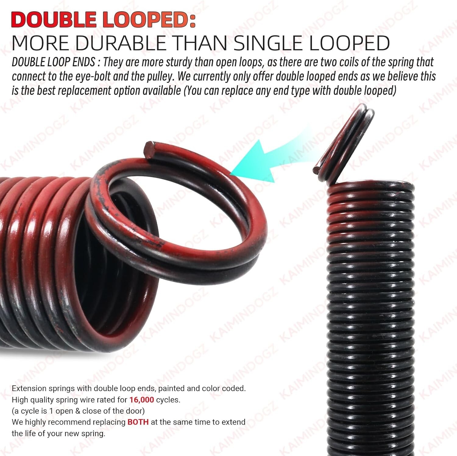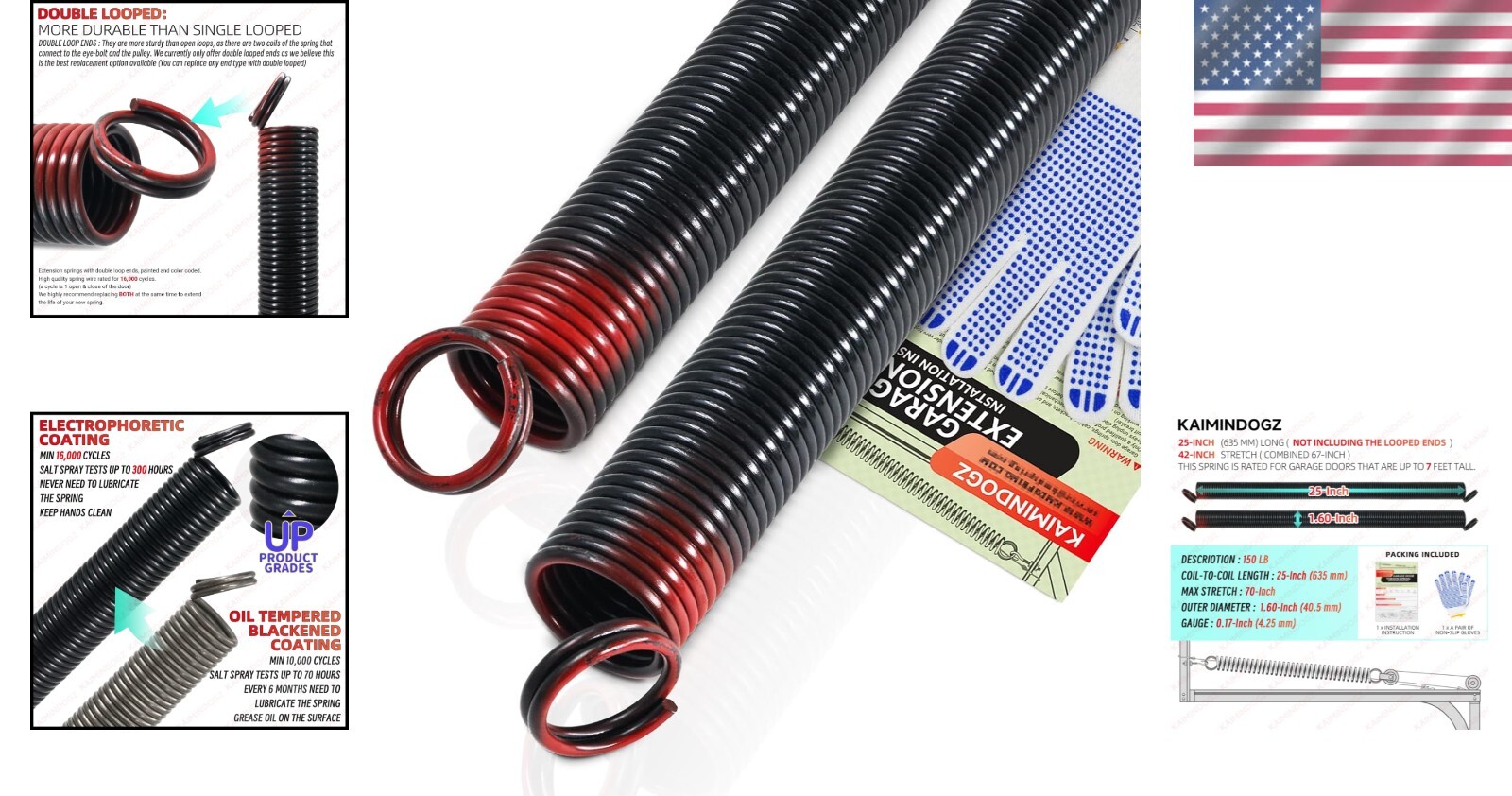 High Precision 150lb Garage Door Springs - 16,000 Cycles with Gloves Included ‹ › ‹ › ‹ › ‹ › ‹ › ‹ › ‹ › ‹ › High Precision 150lb Garage Door Springs -Designed for stability and durability with a cycle life of 16,000. -Dimensions: One Pair of 150lb Heavy Duty Garage Door Extension Springs (Red) measuring 25 inches long at rest and extending to 67 inches when fully stretched. -Ideal for residential door configurations up to 7 ft tall. What’s Included: One Pair of Garage Door Extension Springs One Pair of Non-Slip Gloves for a secure installation Easy to follow Installation Instructions to get you started right away Quality Assurance: Constructed from professional ASTM-A228 spring steel coils that have undergone heat treatment for exceptional durability. Latest electrophoretic coating technology provides commendable corrosion resistance and superior tensile strength. Proven to withstand salt spray testing for up to 300 hours, ensuring longevity and consistent performance. No maintenance required—keep your hands clean during installation! Double Loop Ends: Our springs feature double loop ends, making them sturdier than traditional open loops. Utilizing two coils, these connections to the eye-bolt and pulley enhance durability and reliability. Replace any end type with our double looped option for optimal performance. Important Recommendations: For safety and longevity, it’s highly recommended to replace both springs simultaneously. As springs age together, one failure typically signifies the second will soon follow, resulting in unequal pull that may lead to damage and unsafe conditions for your garage door system. Why Choose Our High Precision Garage Door Springs? Invest in peace of mind and superior quality with our High Precision 150lb Garage Door Springs. With exceptional durability and a generous cycle life, unlock the confidence of knowing your garage door operates smoothly and efficiently. Enjoy easy installation, included accessories, and safety features that set our product apart. Order yours today and experience unmatched reliability! Shipping Free & Fast Shipping - We offer free shipping to most of the USA with a normal delivery time of 3-7 days. However, due to the current situation, additional delivery time (up to 3 weeks) may be required for some items. Alternative Carriers - We may use alternative carriers (e.g. USPS, FedEx, UPS, etc.) to ensure your package arrives safely and on time. Due to the use of multiple carriers, we are unable to provide a tracking number automatically. Handling Time - Orders are processed and shipped within 1-2 business days of receiving cleared payment. Shipping Restrictions - Shipping to Alaska, Hawaii, Puerto Rico, Guam, and other US territories may incur shipping charges or delivery restrictions. Please contact us before ordering, or your order can be refunded/cancelled. State Restrictions - There may be restrictions based on your state of purchase. For example, certain items may not be shipped to California due to state regulations. Contact for Tracking Updates - If you require tracking updates or have any concerns about the delivery of your order, please feel free to contact us, and we will be happy to assist you. Return 30-Day Hassle-Free Returns - We want you to be completely satisfied with your purchase. If you are not, you can return the item within 30 days of receiving it for a full refund or exchange. Easy Return Process - To start a return, simply contact us and we will provide you with a prepaid return shipping label and detailed instructions. Restocking Fee - There are no restocking fees for returns. However, the buyer is responsible for return shipping costs if the return is not due to a seller's error. Refund Processing Time - Refunds will be processed within 5 business days of receiving the returned item in its condition. Payment We accept all major credit cards, PayPal, and Apple Pay for your convenience. Your payment information is secure and encrypted to ensure a safe and seamless transaction. Please complete your payment within 3 days of purchase to avoid any delays in shipping. Feedback Your feedback is extremely important to us. We strive to provide the best products and customer service possible. If you are satisfied with your purchase, please take a moment to leave us a positive review. If you have any concerns or issues with your order, please contact us before leaving negative feedback. We are committed to resolving any problems and ensuring your satisfaction. Contact Us If you have any questions or concerns, please feel free to out to our customer support team. You can contact us through the eBay messaging system. We are available Monday to Friday, 9:00 am to 5:00 pm EST, and we will do our best to respond to your inquiry within 24 hours. Buy it now and enjoy a pleasant shopping experience! Unit Quantity: 150 Type: Springs Style: Heavy Duty Unit Type: lb