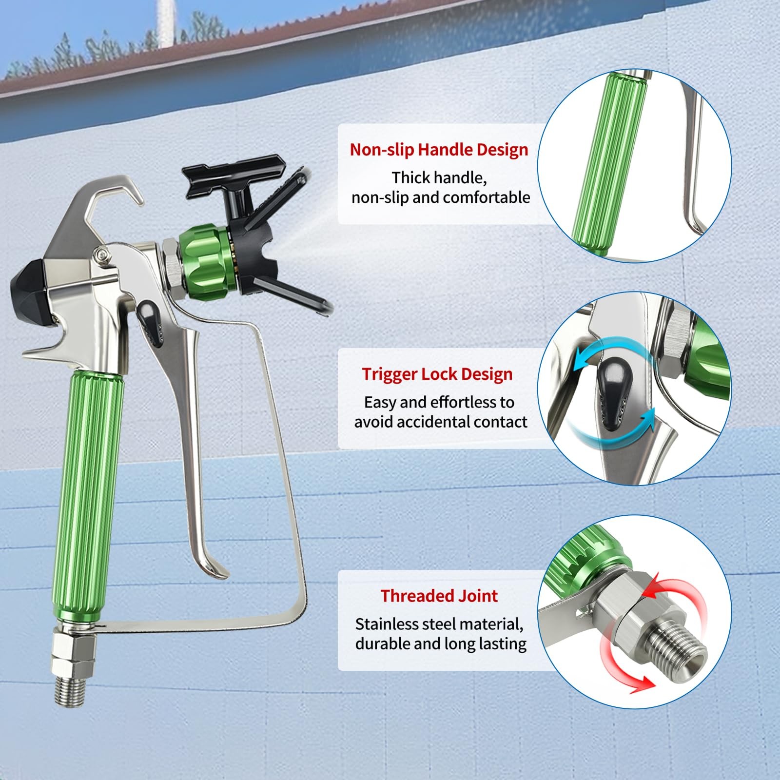 Airless Paint Sprayer Gun Package Quantity: You will get a sprayer gun kit, including a paint spray gun, a 517 reversible spray tip, a tip guard, 5 pcs airless spray gun mesh filters and an abrasion-resistant gun needle. The airless sprayer tool kit can meet your daily spraying needs Quality Materials: Airless gun is made of high quality aluminum alloy, airless nozzle is made of 304 stainless steel handle and tungsten carbide hole; airless nozzle tip guard is made of metal and plastic. Rustproof and wear-resistant, can be used for a long time High Efficiency Spray Gun: Equipped with 3600 PSI high pressure and reversible 517 nozzle , the sprayer gun provides faster, more uniform spraying and saves paint. The 60 mesh gun filter can filter paint and reduces nozzle clogging. Safety lock design locks the handle when not spraying to ensure paint does not drip Practical to Use: Airless paint spray gun is easy to install. First, install the tip seal onto the reversible spray nozzle, then insert the tip seal into the protective tip guard, and then insert the paint spray nozzle into the protective base, and finally rotate the fixed. The sprayer gun repair kit is easy to replace on a daily use Widely used: The airless spray gun can be widely used for paints, latex paints, primers and other kinds of water-based coatings, suitable for spraying commercial buildings, home decorations and other places