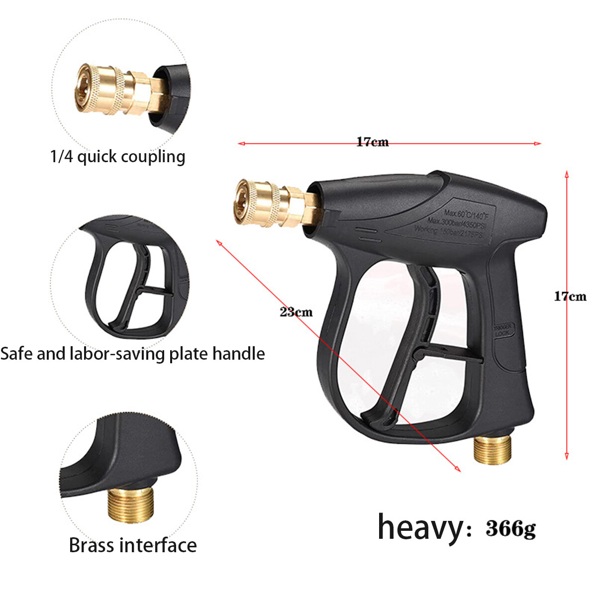 Package Include: Pressure washer gun x 1 Spray Nozzle x 5 (0, 15, 25, 40, and 65 degree) Brass Coupler x 1 (M22-14 female to M22-15 male) Kindly Notes : Make sure the nozzles is fastened to the gun handle tightly, or it will leak. Wash the pressure washer gun and nozzles by clean water after using. Pressure Washer Gun 4350 PSI NOT FIT GARDEN HOSE AND WATER HOSE. It is made of engineering plastic, internal structure is brass and stainless steel, which is strong and durable. Specifications: Interface: 1/4" quick disconnection fitting Requires pressure: 150BAR - 2175PSI Maximum pressure: 300BAR - 4350PSI Requires Flow: 2.0Gpm Maximum flow: 5.3Gpm Material: Plastic, Stainless Steel and Brass Highest Water Temperature: 60℃/140℉ Product Features Universal Connector Easy to connect spray nozzles, extension wand, foam cannon etc. More Safety With safety trigger lock ,avoid pulling trigger unexpected, provide safe clean work. Fit Pressure Washer Hoses Connect to M22-14mm pressure washer hose directly. Specification : Degree: 0°, 15°, 25°, 40°, 65° Connector: 1/4 inch Quick Plug Material: Plastic, Brass, Stainless Steel 5 Spray Nozzles Red - 0° Clean in crevices and hard to reach spots, and tough dirt. Yellow - 15° Get stubborn stains and clean rough surfaces, such as concrete and brick. Green - 25° Good for wood, siding, fences, painted surfaces and lawn mowers. White - 40° Gentler, wide angle spray for good for windows and screens. Black - 65° This nozzle is great for spraying detergent. On Jun 13, 2025 at 05:18:11 PDT, seller added the following information:
