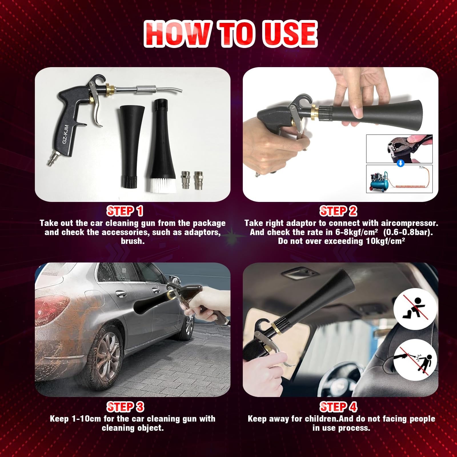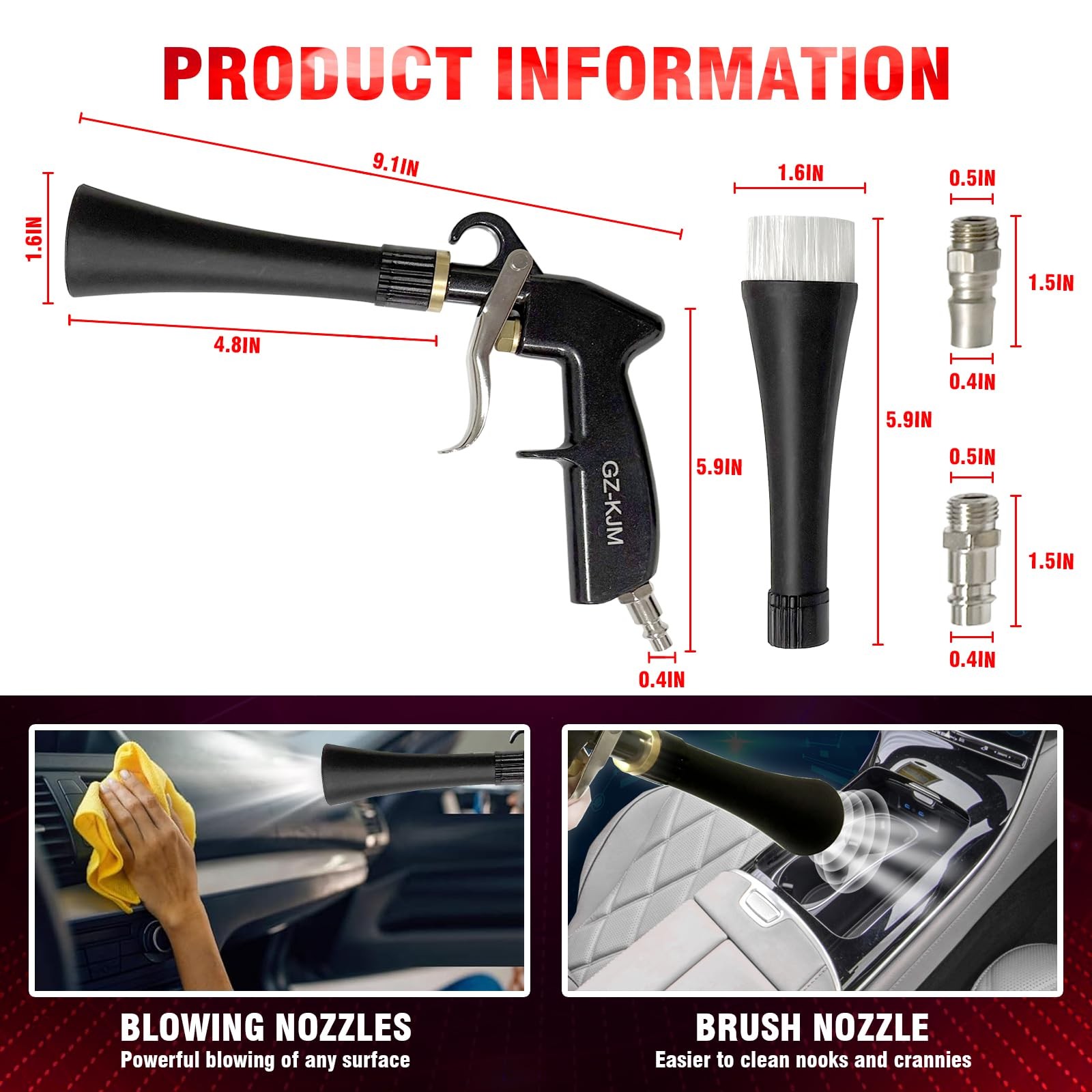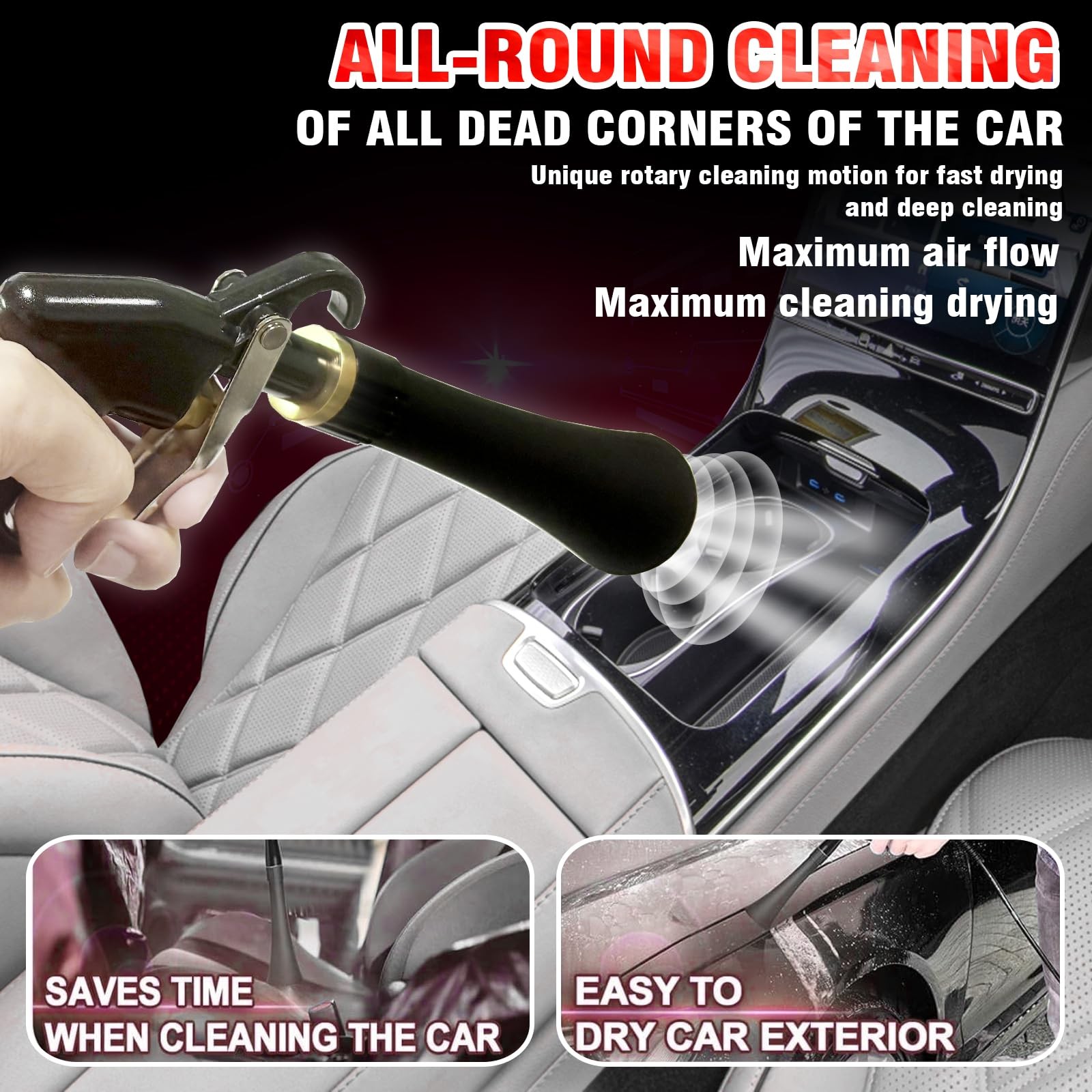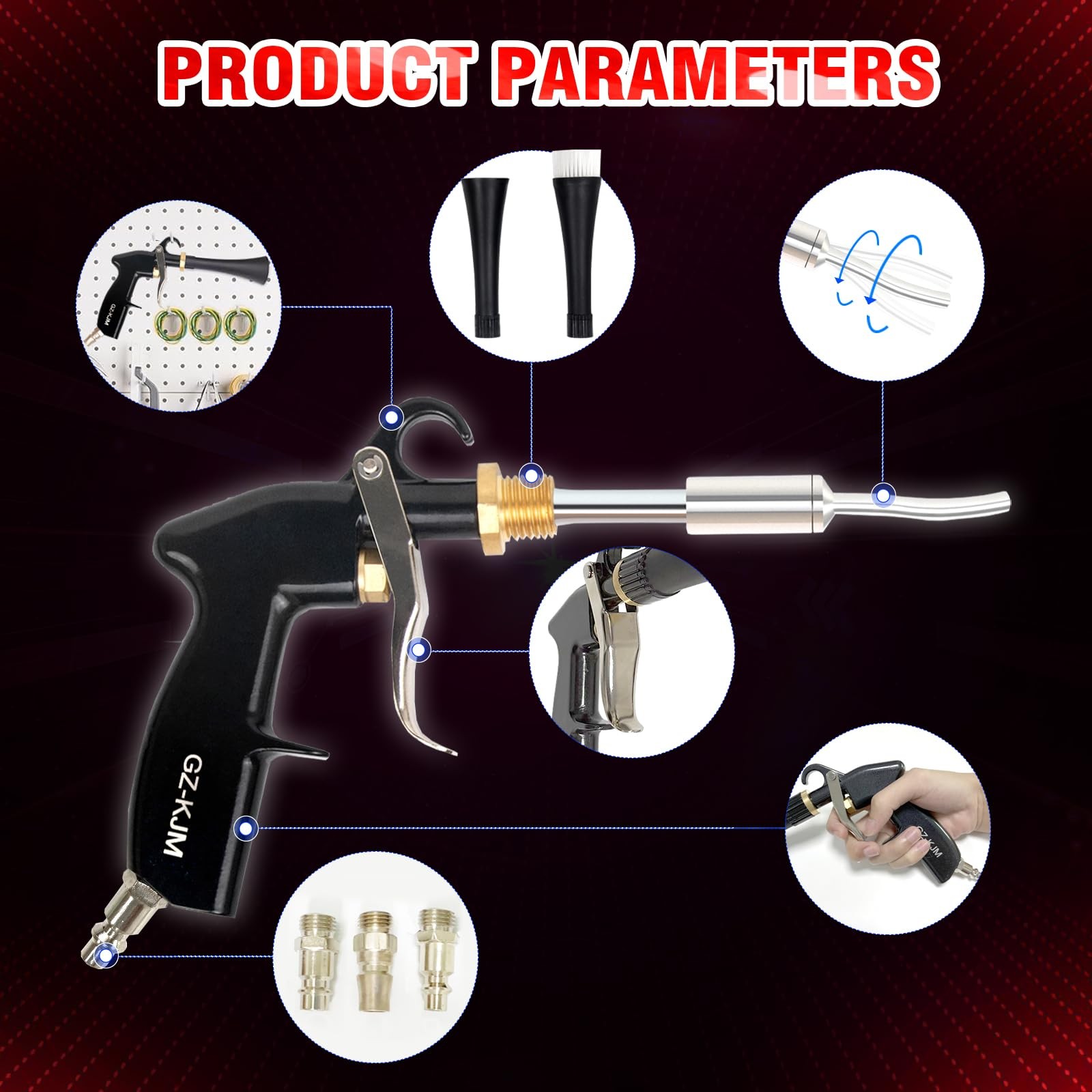 Air Flow Screw Regulator Convenient To Use You Can Adjust The Air Flow Directly On The Gun Instead Of Turning To The Compressor. Precise And Variable Adjustment As a Screw Switch, It Can Adjust The Wind Volume Consecutively And Accurately To Offer What You Want Exactly. Ergonomic And Safe Handle High Hardness: Made Of Refined Aluminum Alloy. Protective Coating: Adopted By Backing Varnish Of Suspended Plating. Handle Shape: Designed As Human Hands, Ease Your Tireness In a Longtime Job. Handle Block: Protect Your Finger From Being Crashed Or Hurt By The Trigger In Use. We recommend that the air compressor be set at 60-160 psi. DOUBLE CONTROL TO GET THE AIR FLOW YOU WANT: To Control The Air Flow Speed, Not Only Can You Use The Trigger, But You Can Adjust The Air Flow Regulator. With The Variable And Consecutive Screw Adjustment, It Can Deliver The Exact Wind Speed Precisely And Conveniently As You Want! HIGH HARDNESS MATERIAL, COMPACT CONSTRUCTION FOR DURABLE SERVICE :Well Manufactured By Refined Aluminum Alloy, The Cleaning Gun Is Of Extra Solid And Compacter Structure. Besides, Adopted By The Protective Baking Varnish. Not Only Makes It Glossy And Porcelain, But Largely Improve The Ability Of Rust & Chemical Corrosion & Wear & Broken Resistant, Ensuring a Long Lifespan Service! WIDELY USED TOOL AND MULTI-FUNCTIONAL APPLICATION --- Two different Nozzle Sprayer Connectors, which can be changed at any time according to different cleaning needs. Mainly used for car interior details, such as dust cleaning of vents, instrument panels, leather seats, carpets, ceilings, etc. ERGONOMIC DESIGN SHAPE TO EASE YOUR FATIGUE : Designed As The Features Of Your Hands, The Handle Is Far Suitable For You To Grip And Hold And The Trigger Is Long Enough For Your Finger To Push, Which Will Ease Your Hands And Offer You An Easy Controlling But Cozy And Relaxing Experience! Besides, The Handle Block Can Protect Your Fingers From Hurt By The Trigger In Working! Besides, The Air Flow Regular Enable You To Adjust The Air Flow Precisely and Consecutively. UNIQUE BUT SMART DESIGN YOU CANNOT FIND ANYWHERE: The 360° All-Dimensional Rotating Connector, Made Of Tougher Metal For Wear & Rust Resistant, It Can Have The Air Hose To Swivel Freely So No Wear & Damage When Dragged/ Pulled In Use!