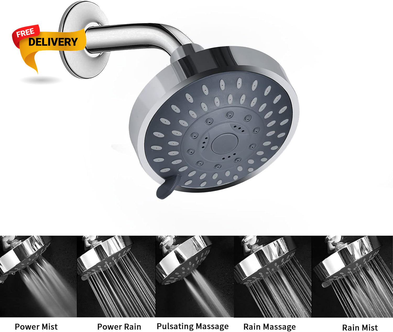 Fast Shipping On All Items 30 Days Money Guarantee Customer Support Excellent Service 100% Satisfaction Satisfaction Guaranteed Shower Head High Pressure Rain Fixed Showerhead 5-Setting with Adjustable Metal Specification Item model number GLP21651 Style Fixed Shower Head Country of Origin China Batteries Included? No Usage Shower Batteries Required? No Finish Chrome Flow Rate 2.5 Gallons Per Minute Material Acrylonitrile Butadiene Styrene Number of settings 5 Installation Type Wall Mounted Setting Type Rain Finish Type Chrome Item Package Quantity 1 Number of Jets 1 Item Weight 7.8 ounces Flow Rate Description 2.5 Gallons Per Minute, 2.5 Gallons Per Minute Special Features High Pressure Special Feature High Pressure Part Number 21651 Water Consumption 2.5 Gallons per Minute Color Chrome Shape Round Included Components Leakage Teflon Tape, Rubber washers, Adjustable Swivel Brass Ball Joint, Installation Instructions, 5 Modes Fixed Shower Head Product Dimensions 3.5"L x 4.1"W Size 4.1 Inch 4.1 "w x 3.5 "w. Weight: 7.8 oz Item Description Powerful Functions - High pressure shower head form rhythmic water pulse, which relieve your body stress and ache, let you enjoy the natural SPA at home Advanced Material- High quality ABS plastic body polished chrome shower head, more durable and beautiful. On the 4.1 Inch panel, self cleaning nozzles increase water impact force to form high pressure Easy Installation - Easily installs fixed shower head with G 1/2 connection thread interface to any standard shower arm in minutes, without plumbers or tools Upgraded 5 Functions: By swinging the lever, you can switch to the mode you like: Power Mist Mode, Power Rain Mode, Pulsating Mode, Rain Massage Mode, Rain Mist Mode 360 Rotating: The adjustable metal ball joint with effortless 360 degree rotation allows this rain shower head to be flexible to any angle or direction for a more comfortable shower experience About us We offer the best prices around on high quality products. Our E-store includes media such as books, movies, music and games while offering electronics, toys, sporting apparel, clothing, tools, general home, garden items and more. Shipping We are always working hard to ensure your package arrives as soon as possible. Please understand that some factors like weather, high postal traffic, and the performance of shipping companies are outside of our control. We offer free shipping to the lower 48 states and ship within 2-3 business days of payment, usually sooner. We do not accept P.O. Boxes. Please provide a physical address. For shipping outside of the continental USA, we only use eBay's Global Shipping Program.The item is shipped to KY and then sent to the rest of the world. International customers are responsible for all duties and taxes. Continue to check out to calculate costs for shipping the item to your country. Messages regarding eBay's Global Shipping Program MUST be directed at eBay EXCLUSIVELY. Returns We offer a 30-Day Return Policy on items in which you are not completely satisfied with. You have the option of a full-refund or an exchange of the item. No returns are available on items shipped outside of the USA Satisfaction We try over very best to make sure every customer is completely satisfied. If there's a problem, message us! We're happy to help. Payment Options Shop With Confidence