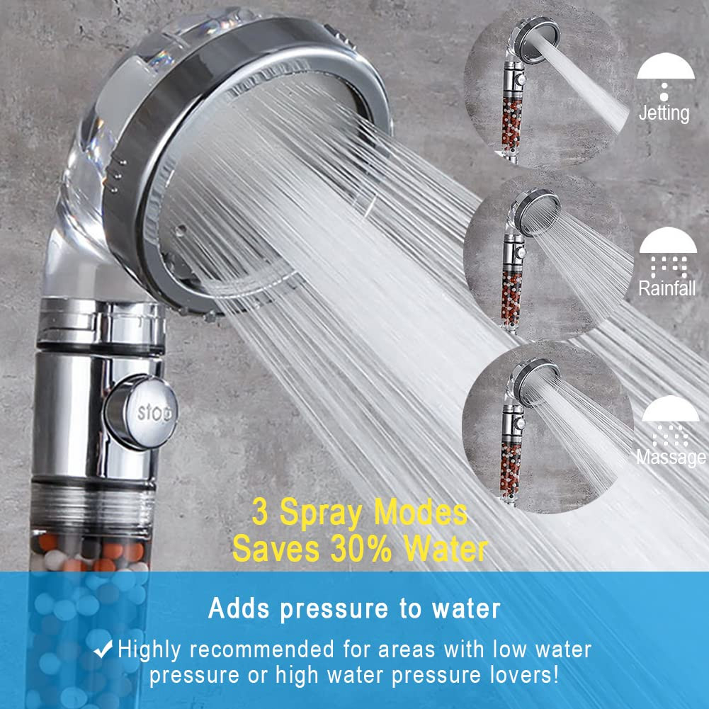 THE SHOWERHEAD KIT - This high pressure handheld shower head comes with everything you need to upgrade your showerhead - shower sprayer, 5ft shower hose, showerhead holder and Teflon tape. HIGH PRESSURE - The laser drilled nozzle makes the outlet holes smaller and denser to increase the speed of the water flow, and thereby to increase the water pressure. In the meanwhile, it saves up to 30% water. HIGHLY RECOMMENDED FOR AREAS WITH LOW WATER PRESSURE, or people who love showering with pressurized water. 3 TYPES OF FUNCTIONAL FILTRATION BEADS - The filtration beads in 3 colors provide multi-layer filtration for tap water. It removes impurities and chlorine and helps greatly soften hard water. This filtered showerhead helps hair loss, dry scalp, itchy skin and dandruff. HIGHLY RECOMMENDED FOR HARD WATER AREAS! 3 MODES OF SPRAY - This handheld shower head comes with 3 modes of spray -Rainfall/ Massage/Jetting to accommodate your comfort. Plus it is with an on/off switch at the handle for easy opening and closing the water flow anytime during shower even with your eyes closed! EASY INSTALLATION - Connects to any standard shower fittings in minutes. Fits any standard shower, including wall-mount, dual spray, rainfall and hand-held showers.