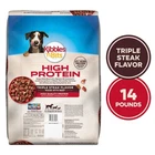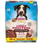 Treat your dog to a cookout without turning on the grill with Kibbles ’n Bits Triple Steak Flavor Dry High Protein Dog Food. Made with beef, this mouthwatering high protein dog food is made with ribeye, filet and New York Strip flavors and features 20% more protein than Kibbles 'n Bits Original. Beef dry dog food formulated with protein that helps support lean muscles and a healthy heart. It's suitable for adult dogs of all sizes and 100% complete and balanced nutrition you can feel good about feeding your furry best friend. Get some now and start making mealtime your dog’s favorite time of day. Contains one (1) 40 lb. bag of high protein dog food in a triple steak flavor Dry dog food made with beef, a high-quality protein that helps support strong muscles This beef dry dog food features three unique steak shaped pieces and a kibble blend with dual-textures and flavors 100% complete and balanced nutrition for adult dogs High protein dog food formulated to be 20% higher in protein than Kibbles 'n Bits Original