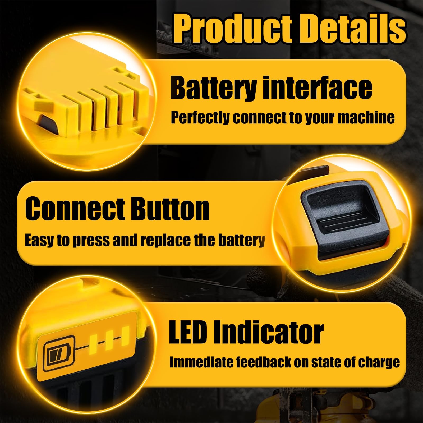 20V Max DCB200 Battery 【Battery Specs】Capacity: 8000Ah, Type: Lithium-ion, Voltage: 20V, Wattage: 160Wh, that can replace original battery 【Compatible with Dewalt 20V Tools and Battery】Replacement for Dewalt 20V Max Battery DCB206 DCB205 DCB204 DCB203 DCB208. Compatible with Dewalt 20V cordless drill(DCD805B, DCD771B, DCD793B, DCD800B, DCD794, DCD999B, DCD996B, DCD799B ect), reciprocating saw, angle grinder tool, heat gun, planer, jig saw ect 【8.0Ah High Capacity】Brand new upgraded 8000mAh capacity and more powerful power and endurance can speed up your work and complete it efficiently. battery longer running time than original battery 【LED Indicator】The battery has power indicator light (three light). Press the button to activate the indicator light to view the remaining battery power: 0%-35%(one light), 35%-75%(two light), 75%-100%(three light) 【Smart Protection】The battery with overcharge protection, over-discharge protection, over-current protection, short-circuit protection, temperature protection, battery balancing management(Ensures even charge distribution among multiple battery cells to extend the overall battery pack's lifespan), smart charging management(Automatically adjusts the charging speed based on the battery's state, optimizing the charging process) 【What You Get ?】2 pack 20V 8.0Ah replacement batteries, user manual, if you have any questions/product quality issues, please feel free to contact us and we will give you a satisfactory answer