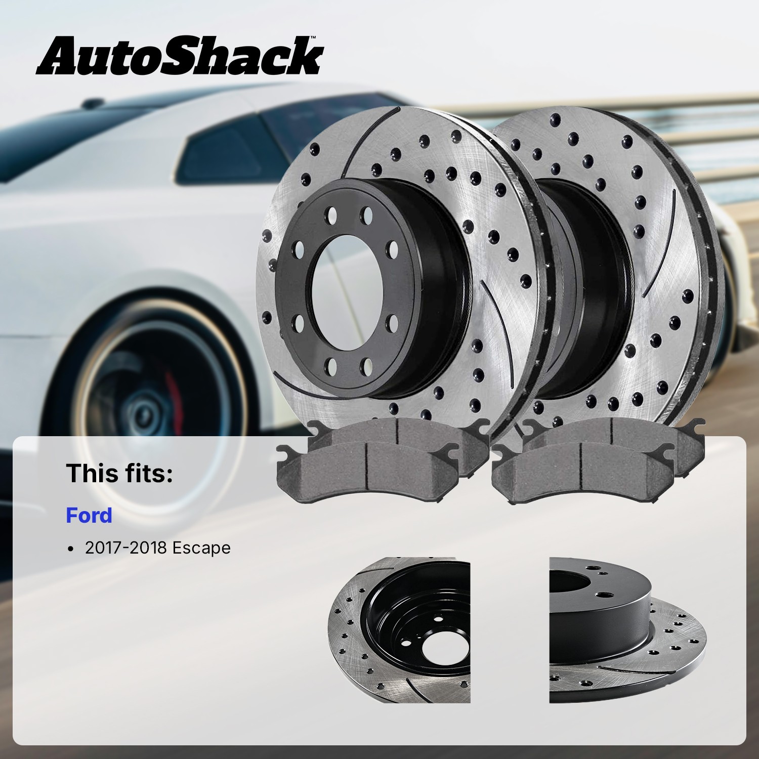 Front & Rear Drilled Disc Rotors Ceramic Brake Pads for Ford Escape 1.5L Customer Service Returns Shipping Information Warranty At AutoShack, we offer exceptional and fast service to ensure you get the right parts as quick as possible. If you have any questions regarding out parts and services, please ask us a question. Business Hours Monday to Friday: 8:00 am - 7:00 pm ET Saturday: 9:00 am - 6:00 pm ET Sunday: Closed You may also send us an email through eBay at the top right corner of this page. "We are committed to provide you, our valued customer, with a 100% customer experience. We welcome you to contact our experienced customer service representatives with any questions you may have." Our Knowledgeable Customer Service Representatives Are Ready To Help. We will gladly accept the return of your purchased item(s) for a full refund as long as the return is made within 30 days of the invoice date and the item(s) have not been damaged or installed. Purchased bundles may only be returned as a complete bundle. Partial returns of bundles is not permitted. Please Note - AutoShack does not provide free return shipping. Return Shipping cost is only covered in the event of an AutoShack error. FREE SHIPPING* ON ALL PURCHASES! Shipping Options Most orders placed with AutoShack qualify for free shipping within the Continental US. Some order will have an additional shipping cost due to package size or being outside of standard delivery area. *Warranty Replacement items covered under AutoShack’s 6 month Warranty and Limited Lifetime warranty do not include shipping costs due to package size or being outside of standard delivery area. Standard Delivery (Included Free) Delivery is between 2-7 business days. The suggested delivery arrival dates on the site are an estimated arrival time and not guaranteed. All shipping carriers reserve the right to extend delivery time by 24 hours to residential deliveries. This is beyond our control and shipping charges will not be refunded for this reason. Upon receiving your order, inspect all packages thoroughly for missing, damaged, or incorrect parts. Our auto parts warehouse puts forth every effort to prevent shipping damage, however, it does occur occasionally. If you receive your product and it is damaged, please contact our customer support as soon as possible as AutoShack will only accept your claim for up to 4 days from the date of delivery. Please document any damage, as we will require photos. Damaged products will not be accepted for refund unless AutoShack customer service has been contacted and the proper documentation has been provided. You can contact us by telephone, by our option to send an email or by chat. Two Day Express Shipping 2 Business Day Express shipping is now available. Orders placed before 12 pm EST will ship on the same business day. Warranty replacements Items do not ship with Express Shipping. If the customer would like to Have the Limited Lifetime Warranty Replacement Shipped Express, they can pay a nominal fee to get Express Shipping. Due to Express Shipping involving Air Travel some items cannot be shipped express at this time. Currently, these items are AutoShack Strut and Shocks. Note: Because we are a retailer and not a wholesaler, there is a maximum purchase limit of $775 per shipping address per 24-hours. Canadian customers can find our listings on eBay.CA Standard AutoShack Warranty IMPORTANT: By using your AutoShack product, you are agreeing to be bound by the terms of the AutoShack Warranty as set out below. Do not use your product until you have read the terms of the warranty agreement. If you do not agree to the terms of the warranty agreement, do not use the product and return it within the return period stated by eBay. AutoShack hereby warrants, to the original purchaser, that all auto parts & accessories contained in the original packaging against any defects in material and workmanship. All parts sold by AutoShack are brand new, serviceable, and functional. If an auto part is found to be defective within six months* from the original date of purchase AutoShack shall, at its discretion, provide a one-time replacement part. AutoShack is not responsible for, and the warranty does not cover, any damages arising from a failure to operate the product within its intended uses. This warranty does not cover products purchased from sources other than AutoShack. No reimbursements will be given for the delay, labor, mileage, or any other costs involved in the installation or re-installation of the auto parts in question. Warranty does not cover parts installed for an incorrect application. Warranty and shipping damage-related claims may require authentication including, but not limited to Mechanic Diagnosis, Pictures or Video of damaged goods – do not dispose of parts until instructed. Failure to provide authenticating documentation could result in denial of the current warranty claim and forfeit of future warranty. Please note that Struts and Complete Struts must be purchased in pairs (front or rear) or warranty is NULL & VOID. All warranty claims require an image of the warrantied part not attached to the vehicle, and an image showing the part stamp, if visible, on the warrantied part. You may be required to return the part for inspection. Once the warranty claim has been reviewed and approved AutoShack will, at their discretion, provide you with a one-time replacement part. We Stand Behind Our Parts With Coverage You Can Count On. OVER 40 YEARS OF SERVICE EXCELLENCE Front and Rear Drilled Slotted Brake Rotors Black and Performance Ceramic Pads Kit Front & Rear Drilled Disc Rotors Ceramic Brake Pads for Ford Escape 1.5L Qty. Part Description 1 PR781015LR 1 PR44366LR 1 PCD1044 Performance Ceramic Brake Pads 1 PCD1095 Performance Ceramic Brake Pads Compatibility Chart ▲ Make Model Year Notes Position Ford Escape 2017 1.5L | Front Wheel Drive | Front 11.81 Inch Rotor Diameter | Rear 12.44 Inch Rotor Diameter | 5 Stud | For