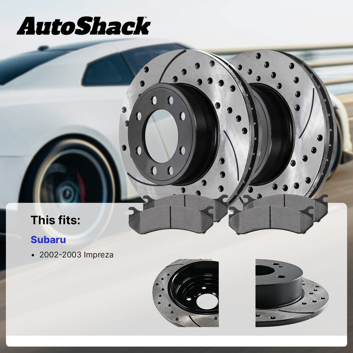 Front & Rear Drilled Disc Rotors Ceramic Brake Pads for Subaru Impreza Customer Service Returns Shipping Information Warranty At AutoShack, we offer exceptional and fast service to ensure you get the right parts as quick as possible. If you have any questions regarding out parts and services, please ask us a question. Business Hours Monday to Friday: 8:00 am - 7:00 pm ET Saturday: 9:00 am - 6:00 pm ET Sunday: Closed You may also send us an email through eBay at the top right corner of this page. "We are committed to provide you, our valued customer, with a 100% customer experience. We welcome you to contact our experienced customer service representatives with any questions you may have." Our Knowledgeable Customer Service Representatives Are Ready To Help. We will gladly accept the return of your purchased item(s) for a full refund as long as the return is made within 30 days of the invoice date and the item(s) have not been damaged or installed. Purchased bundles may only be returned as a complete bundle. Partial returns of bundles is not permitted. Please Note - AutoShack does not provide free return shipping. Return Shipping cost is only covered in the event of an AutoShack error. FREE SHIPPING* ON ALL PURCHASES! Shipping Options Most orders placed with AutoShack qualify for free shipping within the Continental US. Some order will have an additional shipping cost due to package size or being outside of standard delivery area. *Warranty Replacement items covered under AutoShack’s 6 month Warranty and Limited Lifetime warranty do not include shipping costs due to package size or being outside of standard delivery area. Standard Delivery (Included Free) Delivery is between 2-7 business days. The suggested delivery arrival dates on the site are an estimated arrival time and not guaranteed. All shipping carriers reserve the right to extend delivery time by 24 hours to residential deliveries. This is beyond our control and shipping charges will not be refunded for this reason. Upon receiving your order, inspect all packages thoroughly for missing, damaged, or incorrect parts. Our auto parts warehouse puts forth every effort to prevent shipping damage, however, it does occur occasionally. If you receive your product and it is damaged, please contact our customer support as soon as possible as AutoShack will only accept your claim for up to 4 days from the date of delivery. Please document any damage, as we will require photos. Damaged products will not be accepted for refund unless AutoShack customer service has been contacted and the proper documentation has been provided. You can contact us by telephone, by our option to send an email or by chat. Two Day Express Shipping 2 Business Day Express shipping is now available. Orders placed before 12 pm EST will ship on the same business day. Warranty replacements Items do not ship with Express Shipping. If the customer would like to Have the Limited Lifetime Warranty Replacement Shipped Express, they can pay a nominal fee to get Express Shipping. Due to Express Shipping involving Air Travel some items cannot be shipped express at this time. Currently, these items are AutoShack Strut and Shocks. Note: Because we are a retailer and not a wholesaler, there is a maximum purchase limit of $775 per shipping address per 24-hours. Canadian customers can find our listings on eBay.CA Standard AutoShack Warranty IMPORTANT: By using your AutoShack product, you are agreeing to be bound by the terms of the AutoShack Warranty as set out below. Do not use your product until you have read the terms of the warranty agreement. If you do not agree to the terms of the warranty agreement, do not use the product and return it within the return period stated by eBay. AutoShack hereby warrants, to the original purchaser, that all auto parts & accessories contained in the original packaging against any defects in material and workmanship. All parts sold by AutoShack are brand new, serviceable, and functional. If an auto part is found to be defective within six months* from the original date of purchase AutoShack shall, at its discretion, provide a one-time replacement part. AutoShack is not responsible for, and the warranty does not cover, any damages arising from a failure to operate the product within its intended uses. This warranty does not cover products purchased from sources other than AutoShack. No reimbursements will be given for the delay, labor, mileage, or any other costs involved in the installation or re-installation of the auto parts in question. Warranty does not cover parts installed for an incorrect application. Warranty and shipping damage-related claims may require authentication including, but not limited to Mechanic Diagnosis, Pictures or Video of damaged goods – do not dispose of parts until instructed. Failure to provide authenticating documentation could result in denial of the current warranty claim and forfeit of future warranty. Please note that Struts and Complete Struts must be purchased in pairs (front or rear) or warranty is NULL & VOID. All warranty claims require an image of the warrantied part not attached to the vehicle, and an image showing the part stamp, if visible, on the warrantied part. You may be required to return the part for inspection. Once the warranty claim has been reviewed and approved AutoShack will, at their discretion, provide you with a one-time replacement part. We Stand Behind Our Parts With Coverage You Can Count On. OVER 40 YEARS OF SERVICE EXCELLENCE Front and Rear Drilled Slotted Brake Rotors Black and Ceramic Pads Kit Front & Rear Drilled Disc Rotors Ceramic Brake Pads for Subaru Impreza Qty. Part Description 1 SCD770 Ceramic Brake Pads 1 SCD721 Ceramic Brake Pads 1 PR41045LR 1 PR44205LR Compatibility Chart ▲ Make Model Year Notes Position Subaru Impreza 2002 4-Wheel Disc Brakes | WRX | 2.0L | Turbocharged | Front 11.54 Inch Rotor Diameter | Rear 10.47 Inch Rotor Diameter | 5 Stud | Replaces 96121 Front