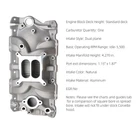 SBC Aluminum Intake for Small Block Chevy 302 305 327 350 400 2701 Details: Engine Block Deck Height: Standard deck Carburetor Quantity: One Intake Style: Dual plane Basic Operating RPM Range: Idle-5,500 Intake Manifold Height: 4.270 in. Port exit dimensions: 1.15" x 1.87" Intake Color: Natural Intake Material: Aluminum EGR:No Notes: Please see the charts and guides tab for a comparison of square bore vs spread bore. Intake will not fit under stock Corvette hood. Fitment: Make Year Engine Type Engine Family Engine Size Carburetor Mounting Cylinder Head Type Application Notes: CHEVROLET 1955-1957 V8 Chevy small block Gen I 4.3L/265 4-barrel square bore Stock configuration No front oil inlet tube provision. Intake will not fit under stock Corvette hood. CHEVROLET 1975-1976 V8 Chevy small block Gen I 4.3L/262 4-barrel square bore Stock configuration Intake will not fit under stock Corvette hood. CHEVROLET 1979-1982 V8 Chevy small block Gen I 4.4L/267 4-barrel square bore Stock configuration Intake will not fit under stock Corvette hood. CHEVROLET 1957-1967 V8 Chevy small block Gen I 4.6L/283 4-barrel square bore Stock configuration No front oil inlet tube provision. Intake will not fit under stock Corvette hood. CHEVROLET 1967-1969 V8 Chevy small block Gen I 4.9L/302 4-barrel square bore Stock configuration Intake will not fit under stock Corvette hood. CHEVROLET 1976-1986 V8 Chevy small block Gen I 5.0L/305 4-barrel square bore Stock configuration Intake will not fit under stock Corvette hood. CHEVROLET 1968-1973 V8 Chevy small block Gen I 5.0L/307 4-barrel square bore Stock configuration Intake will not fit under stock Corvette hood. CHEVROLET 1962-1969 V8 Chevy small block Gen I 5.4L/327 4-barrel square bore Stock configuration Intake will not fit under stock Corvette hood. CHEVROLET 1967-1986 V8 Chevy small block Gen I 5.7L/350 4-barrel square bore Stock configuration Intake will not fit under stock Corvette hood. CHEVROLET 1970-1980 V8 Chevy small block Gen I 6.6L/400 4-barrel square bore Stock configuration Intake will not fit under stock Corvette hood.