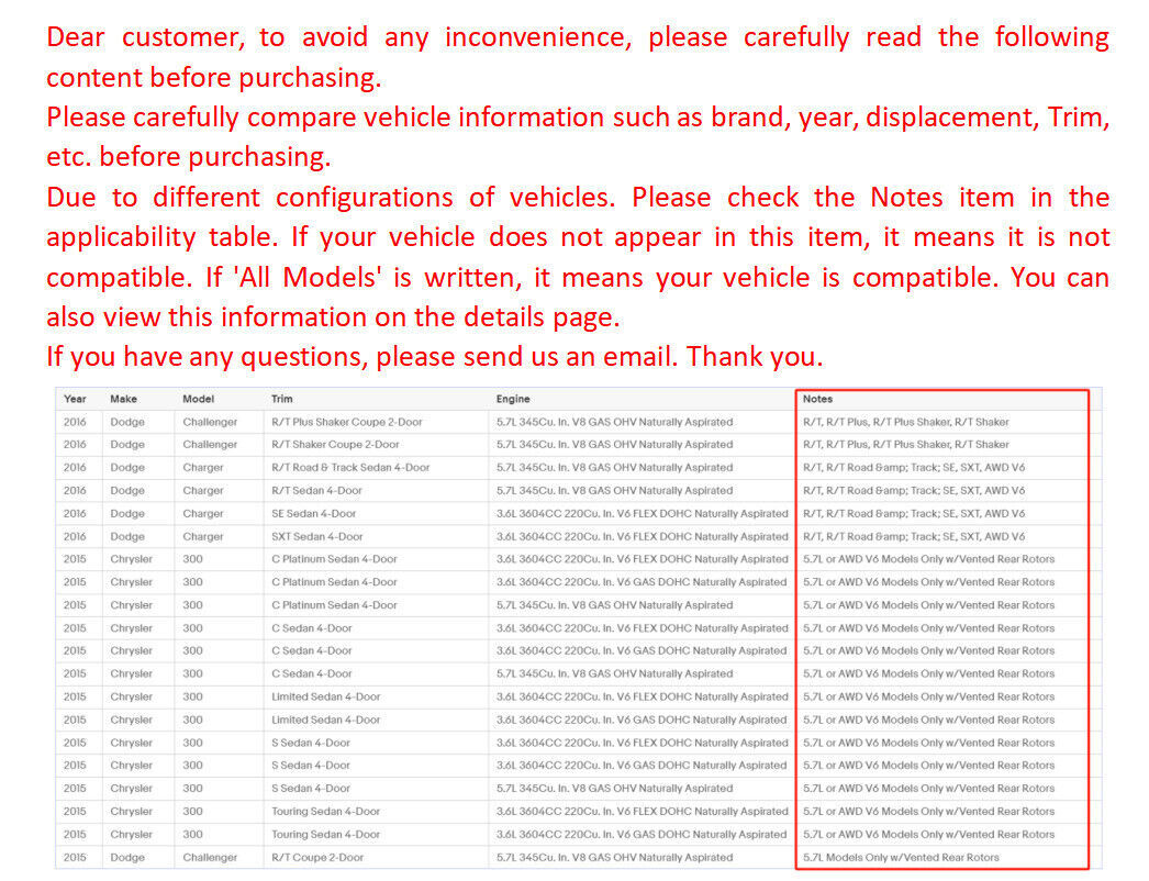 Product Description Front DRILLED Rotors Ceramic Brake Pads for Jeep Patriot Compass Caliber Avenger Front Drilled and Slotted Disc Brake Rotors & Ceramic Brake Pads Kit Fits Driver and Passenger Sides Kit Includes: 2x Front Drilled & Slotted Disc Brake Rotors 2x Front Ceramic Brake Pads w/Hardware Brake Rotor Specifications: Coated in Zinc Diachromate for Rust Prevention Cross Drilled and Slotted Vented Cast from OE Grade Alloy Direct Replacement Fits Left & Right Front of Vehicle 5-Lug Wheel Holes Brake Pad Specifications: Premium Ceramic 4-Piece Front Brake Pad Set FITS: MAKE MODEL YEAR RANGE SPECIFIC DETAILS CHRYSLER 200 2011 - 2014 11.57 inch (294mm) Diameter Rotors ONLY CHRYSLER SEBRING 2007 - 2010 All Models DODGE AVENGER 2008 - 2014 11.57 inch (294mm) Diameter Rotors ONLY DODGE CALIBER 2007 R/T DODGE CALIBER 2008 - 2009 R/T; FWD DODGE CALIBER 2010 - 2012 4 Wheel Disc Brakes; FWD; 11.57 inch (294mm) Diameter Rotors MITSUBISHI ECLIPSE 2006 - 2012 All Models MITSUBISHI GALANT 2004 - 2009 V6 3.8L ONLY MITSUBISHI LANCER 2008 - 2011 GTS ONLY MITSUBISHI LANCER 2012 - 2016 GT ONLY MITSUBISHI OUTLANDER 2007 - 2020 All Models MITSUBISHI OUTLANDER SPORT 2011 - 2020 All Models JEEP COMPASS 2007 - 2017 All Models JEEP PATRIOT 2007 - 2017 Built Before 9/22/2016 Production Date "Not What You Were Looking For? Search Our Store Page To Find The Right Part! About Us We Focus On Creating The Best Product. Only High End Advanced Optical Design Are Adopted. Delivery Details Usually 1-5 Business Shipping Days. For Remote Areas, It Could Be A Little Longer. " About US We focus on creating the best product. Only high end advanced optical design are adopted. Delivery Details Usually 1-5 Business shipping days. For remote areas, it could be a little longer. Return Policy Seller pays postage if a wrong order, don't like it, or change mind. Seller pays postage if shipping damage or manufacturer defect. Returned item must be in the original package within 30 days upon receipt. Service Guaranteed Your purchase is protected, with money back guaranteed. Any concern, we will try our best to help you. Contact Us Our working time(excluding holidays): Monday to Friday, 9:00-18:00. (Beijing Time) powered by