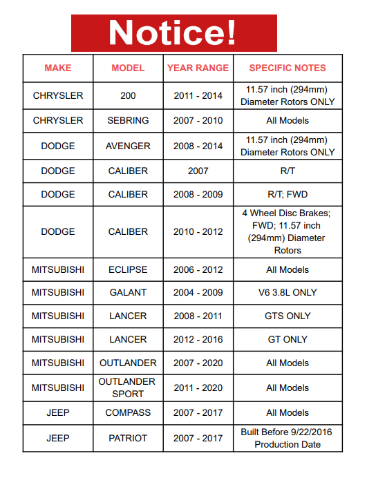 Store Categories Store Categories Air Filter Brake Pads Brake rotor Brake rotor and pads Car Gauge Catalytic Converter Center Support Door handle Cover Suspension Parts Wheel Hub Work Light Other Details Front Drilled and Slotted Brake Rotors & Ceramic Pads Kit 2x - Drilled & Slotted Disc Brake Rotors : 31346 4x Ceramic Brake Pads : D866 Specifications: For Both Driver & Passenger Side Cast from OE Grade Alloy Machined to OE Specs Direct Replacement 5-Lug Wheel Holes D urable Coating protects against harmful corrosion & rust FITS: MAKE MODEL YEAR RANGE SPECIFIC DETAILS CHRYSLER 200 2011 - 2014 11.57 inch (294mm) Diameter Rotors ONLY CHRYSLER SEBRING 2007 - 2010 All Models DODGE AVENGER 2008 - 2014 11.57 inch (294mm) Diameter Rotors ONLY DODGE CALIBER 2007 R/T DODGE CALIBER 2008 - 2009 R/T; FWD DODGE CALIBER 2010 - 2012 4 Wheel Disc Brakes; FWD; 11.57 inch (294mm) Diameter Rotors MITSUBISHI ECLIPSE 2006 - 2012 All Models MITSUBISHI GALANT 2004 - 2009 V6 3.8L ONLY MITSUBISHI LANCER 2008 - 2011 GTS ONLY MITSUBISHI LANCER 2012 - 2016 GT ONLY MITSUBISHI OUTLANDER 2007 - 2020 All Models MITSUBISHI OUTLANDER SPORT 2011 - 2020 All Models JEEP COMPASS 2007 - 2017 All Models JEEP PATRIOT 2007 - 2017 Built Before 9/22/2016 Production Date Terms of sales Shipping Policy Payment Method Returns Policy Terms of sales • Please leave us a good rating after you have received the item and are happy with our transaction. If there are any issues, please contact me first before leaving a neutral, negative or 5 star rating. Customer Satisfaction is our top priority!! We promise we can make you happy if you give us a fair chance. Thanks and happy bidding! • Anyway, if you have any troubles,please feel free to contact us.We're willing to do anything resonable to help you out.Please do not leave any negative or neutral feedback before letting us know. Thanks! Shipping Policy • Items are usually shipped out within 24 hours during the business days after payment has been received. (except Saturday and Sunday).Delivery Time is about 4-7 business days to most of regions. We are not responsible for any wrong or undeliverable addresses. Please verify and update your shipping address on eBay during checkout. Payment Method • PayPal Preferred, Credit or debit card through PayPal. Returns Policy • All returned products (Replacements or Refund) need to be assigned an RMA # (Return Merchandise Authorization #) prior to return. Please contact us through eBay's messaging system to obtain an RMA# for the return. Any returned product without an RMA # on package will not be accepted or processed. Warranty Warranty • All of our brand new items come with a 30-60 Days money-back guarantee. We define the item as defective only if it doesn't function as described. • It is the buyer's responsibility to understand the item description before bidding. We will replace the defective items, provided that they are in stock within the warranty period posted with the listing. We will refund the purchase price if the replacement is not available or buyer prefers a refund and send the original item back at his/her own cost. • The guarantee will be only for the cost of the item, we will not responsible for installation or other fees like labor expenses, towing expenses, additional repair expenses or other related expenses. About us About us • We have developed long-term relationships with world-renowned suppliers to ensure our products meet the highest industry standards. Whether it's wheel Hub, drivetrain or brake components, we offer a wide range of product lines to suit a variety of makes and models. Whether you are a garage, a car owner or a car enthusiast, we offer personalised advice based on your needs to ensure you choose the most appropriate parts. Copyright©2023 One-topauto20 Store Categories Store Categories Air Filter Brake Pads Brake rotor Brake rotor and pads Car Gauge Catalytic Converter Center Support Door handle Cover Suspension Parts Wheel Hub Work Light Other Details Front Drilled and Slotted Brake Rotors & Ceramic Pads Kit 2x - Drilled & Slotted Disc Brake Rotors : 31346 4x Ceramic Brake Pads : D866 Specifications: For Both Driver & Passenger Side Cast from OE Grade Alloy Machined to OE Specs Direct Replacement 5-Lug Wheel Holes D urable Coating protects against harmful corrosion & rust FITS: MAKE MODEL YEAR RANGE SPECIFIC DETAILS CHRYSLER 200 2011 - 2014 11.57 inch (294mm) Diameter Rotors ONLY CHRYSLER SEBRING 2007 - 2010 All Models DODGE AVENGER 2008 - 2014 11.57 inch (294mm) Diameter Rotors ONLY DODGE CALIBER 2007 R/T DODGE CALIBER 2008 - 2009 R/T; FWD DODGE CALIBER 2010 - 2012 4 Wheel Disc Brakes; FWD; 11.57 inch (294mm) Diameter Rotors MITSUBISHI ECLIPSE 2006 - 2012 All Models MITSUBISHI GALANT 2004 - 2009 V6 3.8L ONLY MITSUBISHI LANCER 2008 - 2011 GTS ONLY MITSUBISHI LANCER 2012 - 2016 GT ONLY MITSUBISHI OUTLANDER 2007 - 2020 All Models MITSUBISHI OUTLANDER SPORT 2011 - 2020 All Models JEEP COMPASS 2007 - 2017 All Models JEEP PATRIOT 2007 - 2017 Built Before 9/22/2016 Production Date Terms of sales Shipping Policy Payment Method Returns Policy Terms of sales • Please leave us a good rating after you have received the item and are happy with our transaction. If there are any issues, please contact me first before leaving a neutral, negative or 5 star rating. Customer Satisfaction is our top priority!! We promise we can make you happy if you give us a fair chance. Thanks and happy bidding! • Anyway, if you have any troubles,please feel free to contact us.We're willing to do anything resonable to help you out.Please do not leave any negative or neutral feedback before letting us know. Thanks! Shipping Policy • Items are usually shipped out within 24 hours during the business days after payment has been received. (except Saturday and Sunday).Delivery Time is about 4-7 business days to most of regions. We are not responsible for any wrong or undeliverable addresses. Please verify and update your ship
