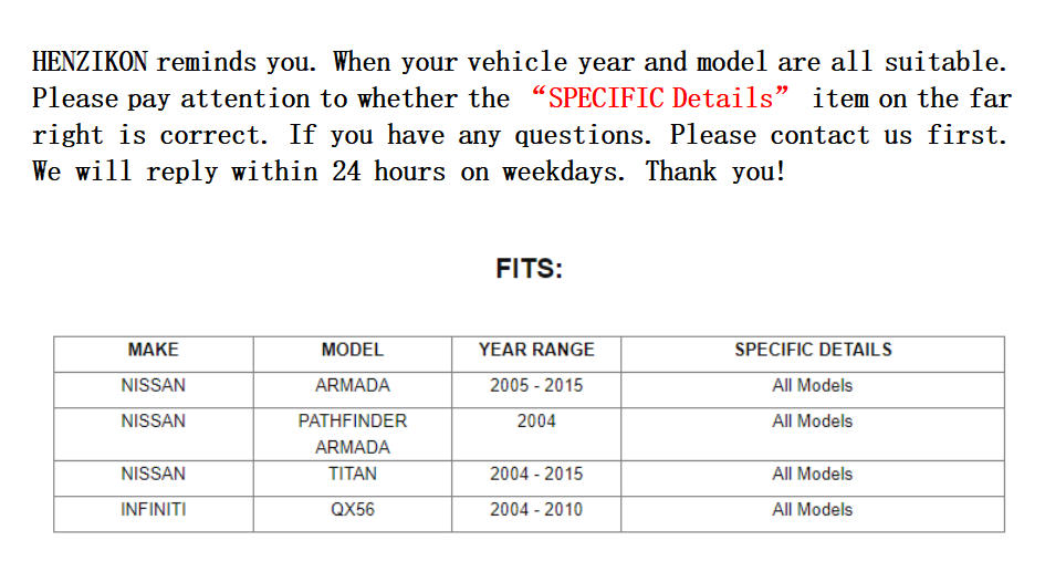 Product Description Rear Disc Rotors Brakes Pads for Nissan Pathfinder Armada Titan Infiniti QX56 4pc Rear Disc Brake Rotors + Brake Pads Kit Kit Includes: 2x Rear Disc Brake Rotors - Driver and Passenger Side - R-31329 2x Rear Ceramic Brake Pads (Hardware Included) - Driver and Passenger Side - P-1041 Specifications: Zinc Dichromate Coated for Rust Prevention Fits Left & Right of Vehicle Cast from OE Grade Alloy Machined to OE Specs Direct Replacement FITS: MAKE MODEL YEAR RANGE SPECIFIC DETAILS NISSAN ARMADA 2005 - 2015 All Models NISSAN PATHFINDER ARMADA 2004 All Models NISSAN TITAN 2004 - 2015 All Models INFINITI QX56 2004 - 2010 All Models Delivery Details ★ Please note that due to the complexity of the order, delivery times for some items may take longer than expected, leave a message to us for the most accurate ETA for your order. 99.9% of orders are shipped within 2 days. ★ It usually takes 2-5 working days to arrive. Deliveries may be delayed due to holidays and weather. Please allow up to 8 days delivery time. For remote areas, it may take longer. ★ Please provide accurate information for your order ①Full physical address ②Valid phone number ★ We shipped the goods according to the address on eBay,please check the address before placing an order. ★ We are not responsible for any wrong or undeliverable addresses. Please verify and update your shipping address on eBay during checkout. Tracking number will be sent to your Order Detail on eBay once the item has shipped. Return Policy ★60 Days Free Return and Money Back ★If you are not satisfied with your purchase, you can return the item with original packaging back to us for full refund, not any re-stock fee. ★If you receive any wrong items, or damage during the transportation or defect items, we will accept the return and pay the return freight. ★If you have made a mistake on purchase and wish to cancel the order before it is dispatched please ★contact us by ebay massages or email as quickly as possible. ★ The returned products must be placed in a complete box, and we do not allow partial package returns. ★The full refund or replacement will be available for all faulty items, including the original shipping cost. ★Please kindly contact us before return, our representatives will send you the detailed return instruction. ★The guarantee will be only for the cost of the item, we will not responsible for installation or other fees like labor expenses, towing expenses, additional repair expenses or other related expenses. Service Guaranteed ★ This item is backed by a 10 Year Warranty. In the event this item should fail due to manufacturing defects during intended use, we will replace the part free of charge (excludes shipping charges) for the original purchaser. ★ Our warranty covers the replacement of the part only and does not cover any associated costs in regards to labor or any other expenses incurred or associated with the purchase of the part. ★ This item is backed by a warranty against defects in materials and workmanship under its intended use. The warranty does not cover normal wear and tear. ★ The parts that we supply are intended for installation by qualified installers. Warranty will be void due to improper installation. Contact Us Business Hours: Monday to Friday:8:30 am to 5:30 pm (Beijing time) 7:30pm to 4:30am the next day (Eastern time) If you have any questions regarding out parts and services, please ask us a question. You may also send us an email through eBay at the top right corner of this page. About Us Welcome to our HENZIKON eBay store, where safety and performance meet! We specialize in offering premium brake discs (rotors) and brake pads tailored to enhance the stopping power and extend the lifespan of your beloved vehicle. 🚗Why Choose Us? Quality Assured: Every brake disc and pad we sell undergoes rigorous quality control to ensure they meet or exceed OEM standards.Affordable Prices: Get top-notch brake parts without breaking the bank. We offer competitive pricing to keep you and your wallet happy.Quick Shipping: Expedited shipping options available to get your brakes back on track in no time. 💪Safety First: we understand that brakes are the first line of defense when it comes to road safety. That's why we only offer products that prioritize your and your passengers' well-being. 💌Customer Satisfaction: Your satisfaction is our top priority. If you have any questions or concerns, our friendly customer service team is always ready to assist you. powered by On Apr 10, 2025 at 01:19:17 PDT, seller added the following information: