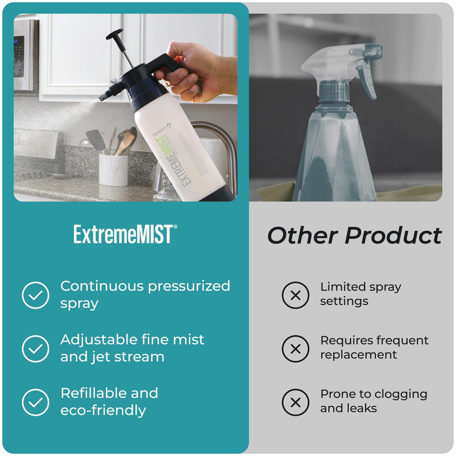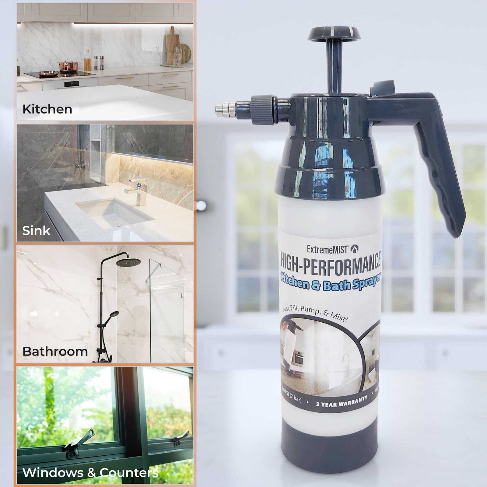 Introducing the High-Performance Kitchen & Bath Sprayer You already know buying those cleaning liquids in bulk saves you money, and helps reduce waste. But most traditional cleaning sprayers you fill with these products are made with flimsy, low-quality nozzles and triggers. Now you can buy your cleaning products in bulk and use them with our high quality and robust pump-up sprayer. Crafted with an adjustable nozzle, you can choose between an ultra-fine mist, a strong jet stream, or anything in between. With just 8-12 pumps, our High-Performance Kitchen & Bath Sprayer delivers an ultra-fine mist or spray, making cleaning faster, easier, and more enjoyable. Simply buy your cleaners in bulk, fill, pump, and mist! Designed for anyone who loves a clean space, whether you’re a homemaker, restaurant owner, or teacher, this sprayer works with most water-solvent cleaning products. It’s perfect for dusting, cleaning, glass, window washing, and more. Built to last with high-grade silicone o-rings, the sprayer is graded for up to 100 PSI pressure. Available in both 20 oz and 32 oz sizes, it’s your go-to cleaning tool for keeping your home spotless. Countless Uses: Spray down kitchen counters Clean bathroom sinks Spray down shower tiles and grout Clean windows and mirrors Spray down kitchen table and dining table Sanitize gym equipment Wash pet crates Clean refrigerator, microwave, and toaster oven Wash granite or marble countertops Spray down classroom desks REUSABLE & DURABLE – Upgrade from flimsy sprayers to our long-lasting high-performance pump sprayer. It works with most of your regular household cleaning products, allowing you to buy in bulk, reduce waste, and save money. HIGH-PERFORMANCE SPRAYER – This handheld mister spray bottle is perfect for cleaning, disinfecting, dusting and washing. It works on all surfaces, appliances, and glass, with mist, spray, and stream settings for any cleaning task. PRESSURIZED CONTINUOUS SPRAY BOTTLE – Pump it 8 to 12 times for a high-pressure mist or a jet stream, and everything in between. The trigger lock allows continuous spraying, making cleaning faster and easier. ADJUSTABLE NOZZLE – Twist the nozzle to switch between an ultra-fine mist, a strong jet stream, or any setting in between. It's graded for up to 100 PSI, perfect for various cleaning needs. EASY TO USE – Simply fill the cleaning spray bottle with your favorite household cleaner, pump it to pressurize, and press the trigger to release a continuous spray or mist. Use It for cleaning your shower, sink, kitchen island, glass windows, counters, bathrooms, living rooms, playrooms and more. NOTE: Each one is factory tested with water to ensure pressurization, and some moisture may remain in the sprayer when it is newly purchased.