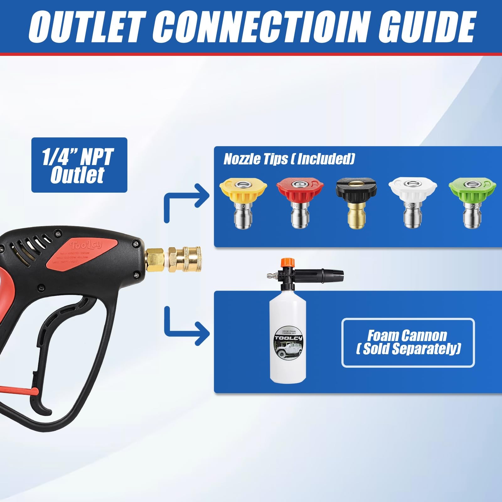 4000 PSI Replacement Power Washer Short Gun with swivel, a durable and versatile accessory suitable for both gas and electric high-pressure washers. With a maximum pressure rating of 4000 PSI and a maximum water flow rate of 7 GPM. The snub nose design makes it easy to maneuver with just one hand,hold the pressure washer gun for long durations without getting tired. The short power washer gun design is very convenient for use with a foam cannon, it delivers outstanding performance. An excellent replacement pressure washer short gun for both homeowners and professionals. It is compatible with renowned brands such as CRAFTSMAN, SIMPSON Cleaning, Briggs & Stratton, Honda, Excell, and more. Package Content: 1*pressure washer short gun 1*3/8" quick connect 1*3/8" socket x M22-14mm coupler 5* nozzle tips Specifications: Working Pressure: up to 4000 PSI Max Water Flow Rate: 7 GPM Outlet: 1/4" Female NPT Inlet: 3/8" Female NPT Working Temperature: Up to 300°F (150°C) [4000 PSI Working Pressure] Short Pressure washer gun with swivel kit is specifically crafted to meet the demands of residential and commercial gas power washers in the USA, max 4000 PSI. Meets the needs of both homeowners and professionals alike, replacement short gun for Craftsman, Simpson, Briggs & Stratton, Honda, Excell, Roybi, and Karcher. High performance and durability in every use [Swivel Design] Short pressure washer gun features a swivel inlet, this design allows your hose to rotate freely while in use, effectively preventing bothersome kinks and the need to wrestle with your hose. Enjoy a hassle-free cleaning experience with improved maneuverability and ease of use [1/4" Outlet] The Power Washer Short Gun features a 1/4" quick connector outlet, tightly connected with various attachments like nozzle tips, foam cannons, and extension wands. Additionally, the pressure washer spray gun can withstand both cold and hot water applications, temperature up to 300℉ (150℃). it's an adaptable tool for a wide range of cleaning tasks [Convenient Attachments] The pressure washer handle come with 1* 3/8" NPT quick plug inlet , 1*3/8" socket x M22-14mm coupler and 5 different nozzles, which allows for easy loading and unloading of the high pressure washer gun. Furthermore, its trigger lock design by preventing accidental mishandling [ATTENTION] Replacement pressure washer gun Not Fit Garden Hose or Water Hose or your faucet directly! Max Flow Rate up to 7 GPM. Max Pressure: 4000 PSI. If need connect to M22-15mm pressure washer hose, please connect a M22-14mm to M22-15mm coupler (not include) between gun and hose [Spray Nozzles] 5pcs 3.0 GPM Pressure washer nozzles with 5 different angle: 0°,15°,25°,40°,65°. They meet your different needs, such as Cleaning Windows, wooden doors, cars, roofs, and more