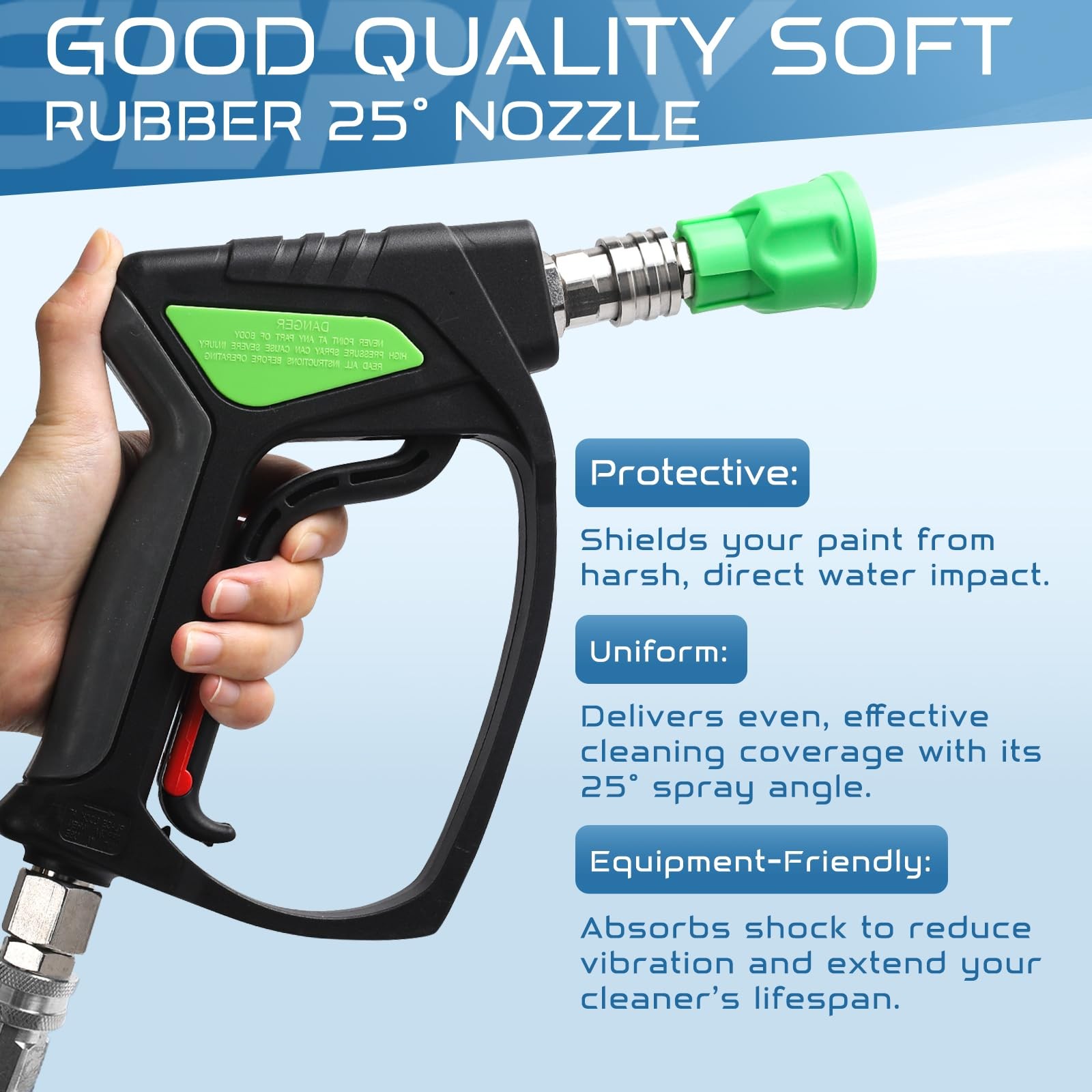 Upgrade your cleaning experience with this Short Pressure Washer Spray Gun , built for high-performance and durability. Designed to handle 5000 PSI of pressure and 10.5 GPM of water flow, this gun is ideal for professional cleaners, automotive detailing, and industrial applications. Crafted with premium brass and stainless steel , this pressure washer gun is highly durable and resistant to rust, ensuring long-lasting performance. It features a 3/8โ quick-connect fitting for effortless hose attachment and includes M22-14mm and M22-15mm adapters , making it compatible with most pressure washers. For enhanced cleaning efficiency, this gun comes with a 25ยฐ rubber nozzle tip , providing a balance between coverage and pressure while preventing surface damage. The short design offers better control and maneuverability , making it easy to reach tight spaces and undercarriages. Additionally, the ergonomic trigger design minimizes hand fatigue, allowing for comfortable extended use. Whether you're tackling driveways, patios, vehicles, or industrial equipment , this high-power washer spray gun delivers unmatched performance and reliability for all your cleaning needs. ๐๐ข๐ ๐ก-๐๐ซ๐๐ฌ๐ฌ๐ฎ๐ซ๐ ๐๐๐ซ๐๐จ๐ซ๐ฆ๐๐ง๐๐โ Designed to handle up to 5000 PSI and 10.5 GPM, this short pressure washer gun delivers powerful cleaning performance, making it ideal for professional and heavy-duty applications ๐๐ฎ๐ซ๐๐๐ฅ๐ & ๐๐๐ฅ๐ข๐๐๐ฅ๐ ๐๐ฎ๐ข๐ฅ๐ โ Constructed from premium solid brass and stainless steel, this spray gun ensures longevity and resistance to corrosion, providing a reliable tool for long-term use in various cleaning environments ๐๐๐ซ๐ฌ๐๐ญ๐ข๐ฅ๐ ๐๐จ๐ณ๐ณ๐ฅ๐ ๐๐จ๐ฆ๐ฉ๐๐ญ๐ข๐๐ข๐ฅ๐ข๐ญ๐ฒ โ Includes a 25ยฐ rubber nozzle tip, perfect for effective surface cleaning with controlled water dispersion. The rubber cover enhances durability and prevents damage from impacts ๐๐ง๐ข๐ฏ๐๐ซ๐ฌ๐๐ฅ ๐๐ฎ๐ข๐๐ค-๐๐จ๐ง๐ง๐๐๐ญ ๐ ๐ข๐ญ๐ญ๐ข๐ง๐ ๐ฌโ Equipped with a 3/8โ quick-connect inlet for fast and secure hose attachment. Additionally, it comes with M22-14mm and M22-15mm adapters, ensuring compatibility with most pressure washers ๐๐ซ๐ ๐จ๐ง๐จ๐ฆ๐ข๐ & ๐๐ฌ๐๐ซ-๐ ๐ซ๐ข๐๐ง๐๐ฅ๐ฒ ๐๐๐ฌ๐ข๐ ๐ง โ The short design provides enhanced control and maneuverability, allowing users to clean tight spaces with ease. The ergonomic trigger grip reduces hand fatigue during extended use.