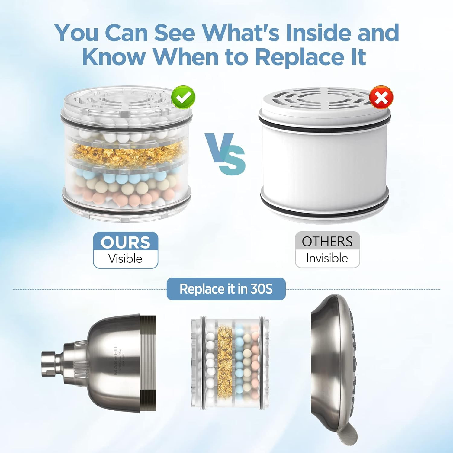 Filtered Shower Head Brushed Nickel - High Pressure Product Details Brand: MakeFit Style: Premium Filter Shape: Round Material: Acrylonitrile Butadiene Styrene Finish Type: Polished Setting Type: Rain, Massage, Intense, Mist Installation Type: Wall Mounted Color: Brushed Nickel Product Dimensions: 5.2"L x 4.7"W Number of settings: 7 Number of Jets: 1 Efficiency: 2.5 GPM Special Feature: Detachable, Easy to Install, Easy to replace shower filter UPC: 799947558018 Manufacturer: Xia Men Yi Fang Yun Science and Technology Ltd. Part Number: H5H117BN Item Weight: 1.32 pounds Country of Origin: China Item model number: H5H117BN Finish: Polished Special Features: Detachable, Easy to Install, Easy to replace shower filter Included Components: Filtered Shower Head x 1, Teflon Tape x 1, Extra Rubber Washer x 1, Instructions x 1 Batteries Included?: No Batteries Required?: No Brand: MakeFit Style: Premium Filter Shape: Round Material: Acrylonitrile Butadiene Styrene Finish Type: Polished Shower Filter for Hard Water: Do you suffer from dry skin, weak hair, or unpleasant smells coming from your showerhead? Look no further than our revolutionary shower filter system, featuring a cutting-edge blend of the most patented KDF-55, advanced Calcium Sulfite, Vitamin C, and More. MakeFit water softener shower head effectively removes chlorine, fluoride, heavy metals, and other contaminants from your shower water, providing clean and pure water for your enjoyment High Pressure Shower Head with 7 Settings: Our shower head features an impressive 7 spray modes, offering flexibility to choose between targeted massage and a range of relaxing spray options. With upgraded air-induction technology, our showerhead provides powerful spray even at low water pressure and flow circumstances. Enjoy the perfect combination of relaxation and rejuvenation with our high-pressure shower head High Quality & Premium Material: Featuring a beautiful brushed nickel finish, this showerhead effortlessly coordinates with a variety of decors and fixtures, adding a touch of sophistication to any bathroom.The angle-adjustable brass swivel ball connector allows for easy adjustment of the rain shower head, ensuring a personalized shower experience. Equipped with anti-clog nozzles, it prevents lime and hard water buildup, ensuring consistent water flow for a refreshing and relaxing shower Reliable & Innovative Design: With the ALL-IN-ONE design, even tall people can stand comfortably without having to bend down while enjoying a healthy and filtered shower experience. The transparent shower head water filter cartridge provides the added convenience of allowing you to see what's inside, enabling you to monitor when it is time to replace it. This innovative feature ensures that you always have access to the cleanest and healthiest shower water available 1-Minute Tool-Free Installation: This fixed shower head filter features universal G1/2" threads, which can be easily attached to any standard shower arm or extender, allowing for effortless installation. Enjoy the ease of installation and the benefits of clean, refreshing water, all in one beautifully designed package. Say goodbye to hard water problems and embrace the luxury of a refreshing and rejuvenating shower with the MAKEFIT Filtered Shower Head
