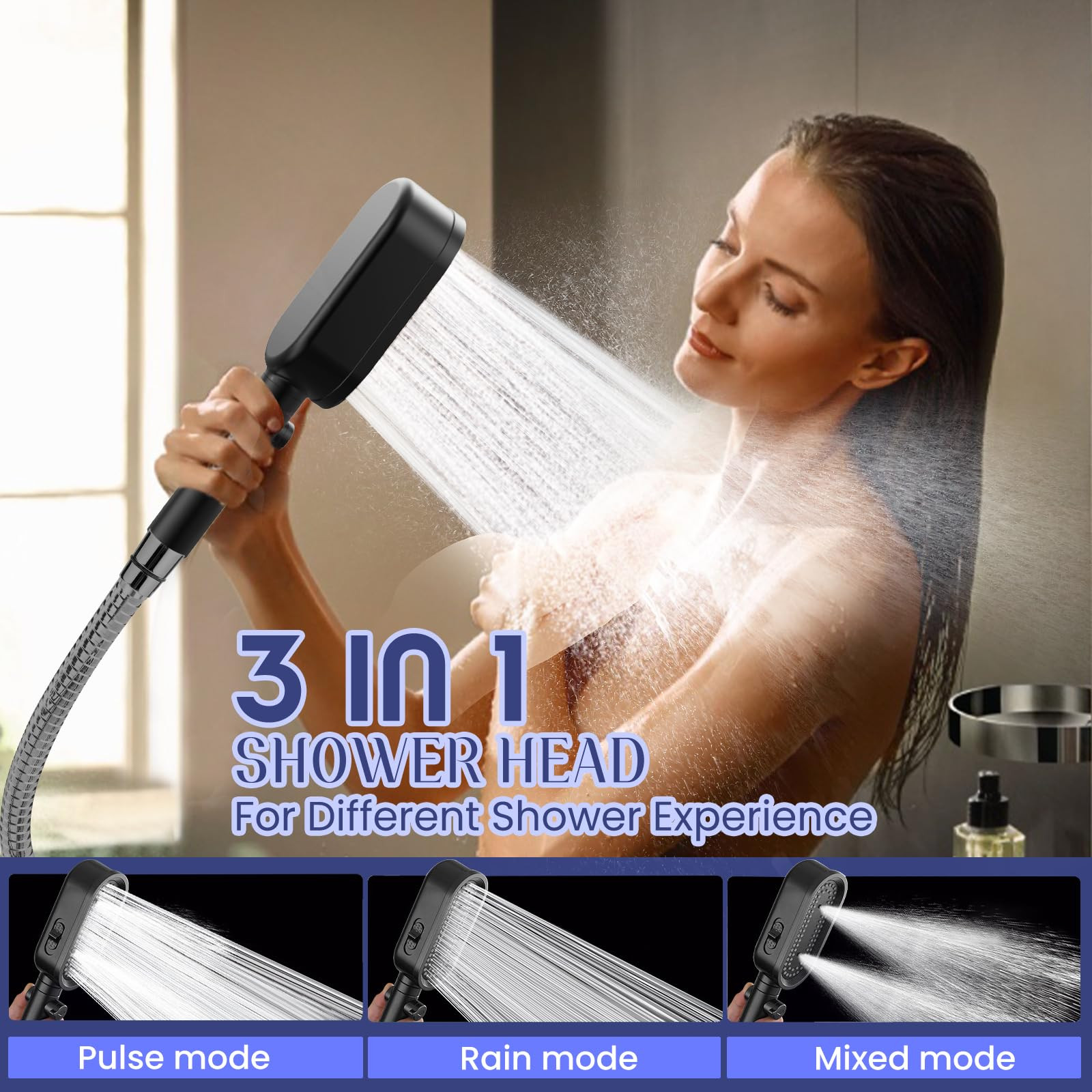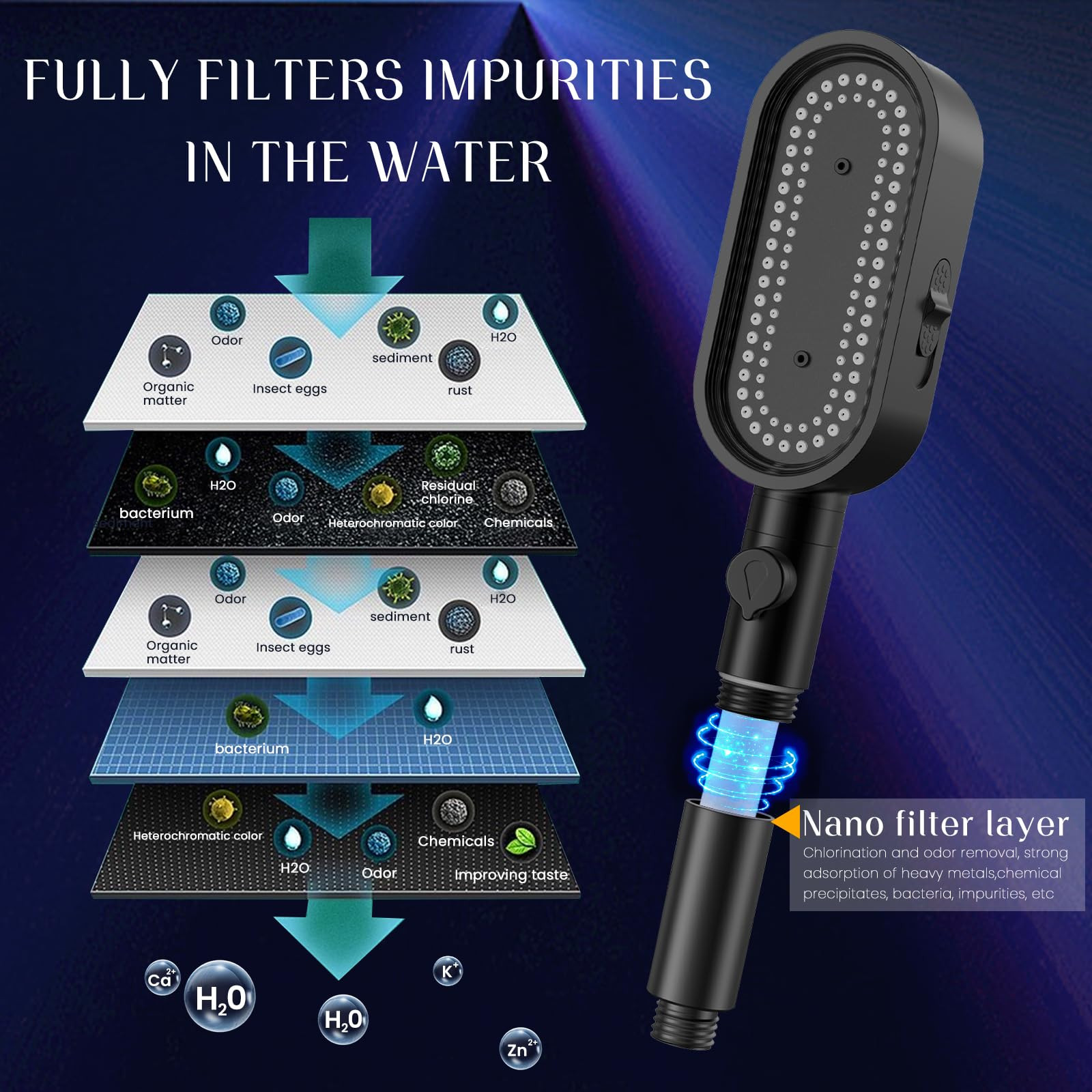The hand held shower head that attach to shower is lightweight and easy to install 【Detachable Shower Head with 3 Spray Modes】shower head features three different spray functions: rain mode, mixed mode, and spray mode. The detachable shower head can be converted to power wash mode when removed in addition to the 3 spray mode settings on the left side 【Filtration Design-Filters Good for Your Skin and Hair】Our filtered shower head with upgraded filtration function. The clean cotton filter can effectively remove impurities in the water, such as dirt and heavy metal, the hard water filter shower head protects the health and safety of your family's skin& hair. Contains 4 high-quality PP filters(one pre-installed showerhead). Recommend to replace it every 3 months 【Adjustable Pressure and On/Off Switch】A separate stop button not only helps you to stop the water immediately while showering but also adjusts the water flow pressure, which is great for saving water during use 【Wide Application】 You can use this shower head with filters for hard water to shampoo your hair, shower, bath your kids, wash your dog, and even use the filtering shower head to flush the toilet as much as you want 【Packing Included】This water softener shower head set includes a handheld shower head with a 59" shower hose (it is made of high-quality stainless steel without a leak), a shower head holder, 3pcs extra shower head filters, a PTFE tape, and a bath loofah 【Easy Installation】The universal G1/2” thread fits any standard shower pipe, arm, extender, or filter, without a plumber and connection toolless, detachable components can be removed and cleaned easily