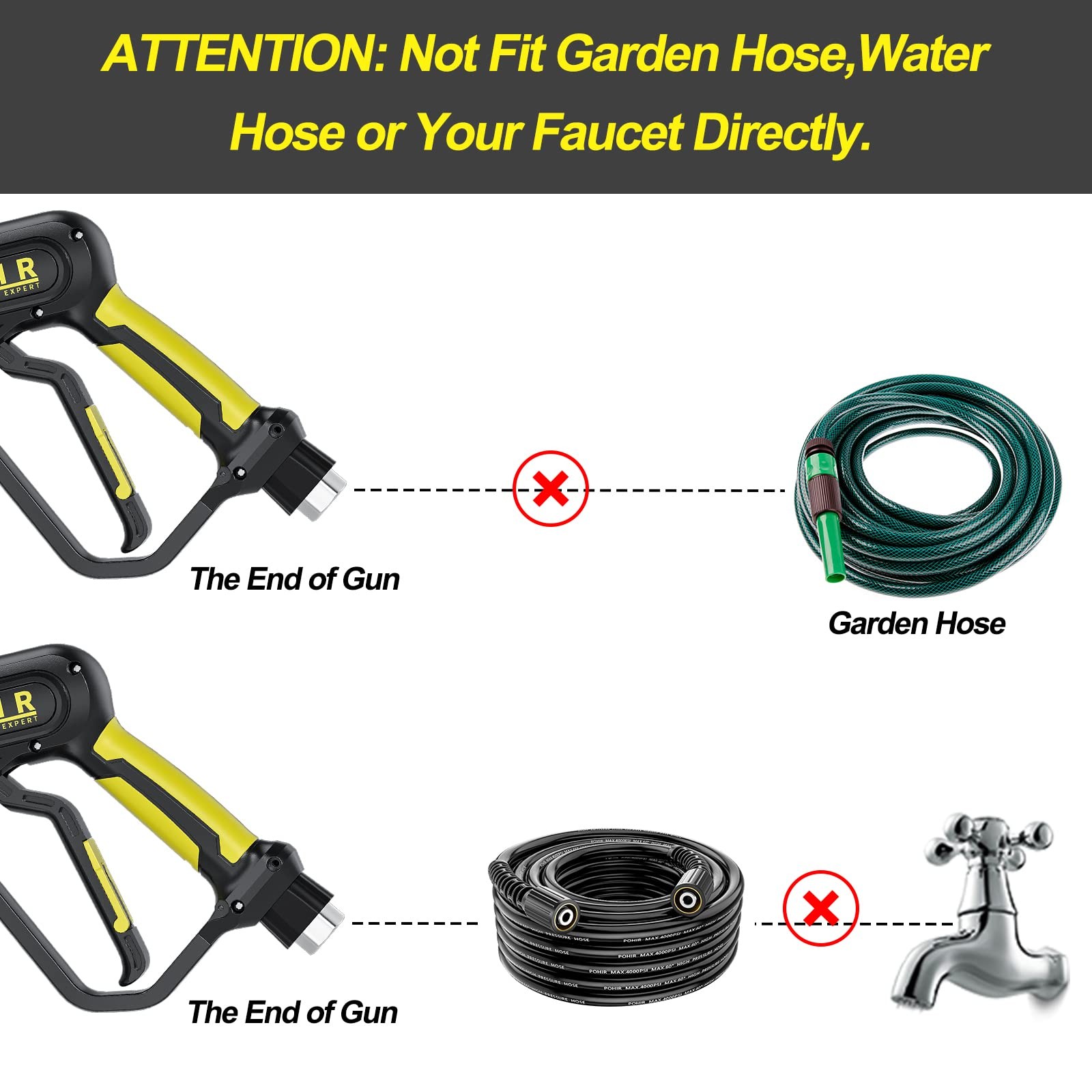 High Pressure Washer Gun 3600 PSI Extension Wand with 3/8'' Swivel Quick Connect, Extension Wand, M22 15mm and M22 14mm Fitting, 7 Nozzle Tips 【Premium pressure washer gun】3600 PSI Max pressure, 8GPM Max Flow. Max temperature of water is rated to 60℃ / 140 F. With M22-14 and M22-15 fittings and 3/8'' connector for direct connection to 14mm or 15mm or 3/8'' inner diameter pressure hose fittings 【Compatible pressure washer】With different fittings inlude M22-14mm fitting, M22-15mm fitting, and 3/8'' quick connector fitting, great for GPM gas power washer replacement hose compatible with the most of pressure washer 【16 inch Extension Wand】This wand make the total length of the gun 30 inches(If you need to connect the extension wand, please use a wrench to remove the 1/4 quick connector on the gun head). 【1/4''standard quick connector】Can be used with any accessory with a 1/4'' plug. Such as nozzles tips, foam cannon, water broom, pivoting coupler, undercarriage cleaner, surface cleaner. Comfortable handle design for easy handling. 【Package include】 1 x 3600psi pressure washer gun,1 x Extension wand,1 x M22 14mm conver fitting, 1 x M22 15mm conver fitting,1 x 3/8" quick connect fitting, 1 x pressure washer nozzle holder, 7 x pressure washer nozzles with different spray angle,Choose different nozzle according to your needs.