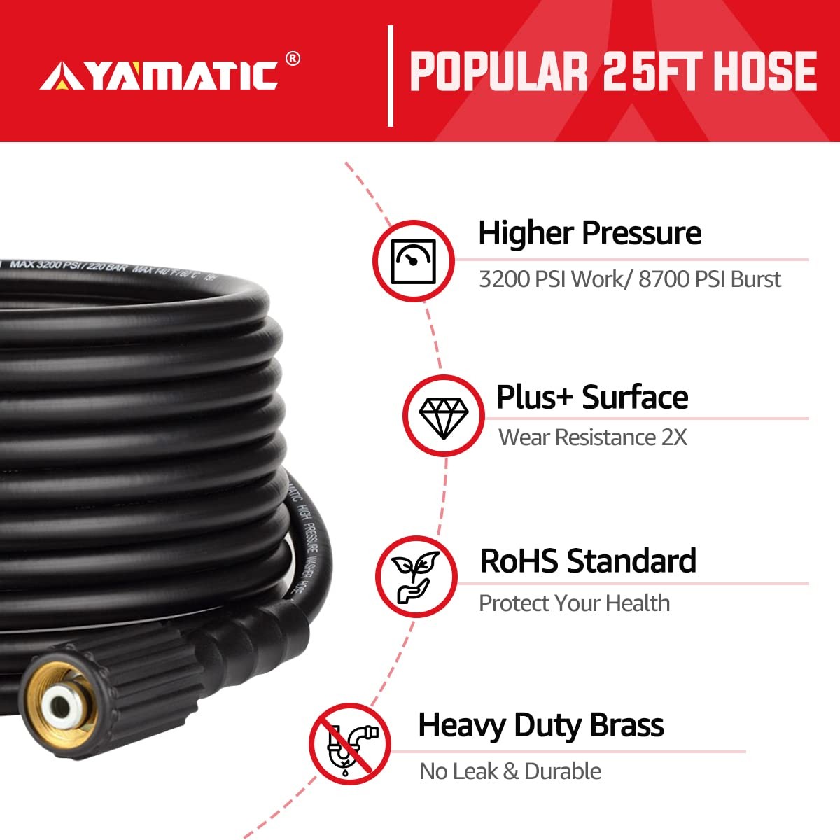 Pressure Washer Gun and Hose With Easy Pull Trigger, Pressure Washer Accessories Kit Power Washer Gun compatible with Honda, Excell, Simpson, Craftsman, Champion, Generac FEATURES 【 Full Set Multi-use 】 Power washer hose and gun kit set with M22 male fitting for connection directly, also fit sun joe pressure washer. It also includes a 3/8" swivel quick connector and 5 spray nozzle tips. Easy setup and unload, provide stable and TOP performance. 【Italian Design】 Italian process and industry experience with high precision return spring, to make sure enjoy washing job with safety and reliability. 【 Durable & Easy Pull Trigger-Lock 】 Designed with an easy-pull trigger lock which is more than 10,000 times durability test for long-time use, durability pressure washer gun, reducing your hand fatigue operation, Easy job all the time! 【 Anti-slip & Shockproof Handle 】 With shockproof reinforced plastic ribbing throughout the entire body of the gun supporting the hose and protecting your hands and no-slip, Comfortable Washing Time! SPECIFICATIONS ➡ Inlet Of Gun: M22 Male Thread & 3/8" swivel quick connector. ➡ Outlet Of Gun: M22-14mm Female Thread ➡ Outlet Of Wand: 1/4" FNPT Brass Quick Connect PLUG. ➡ Inlet Of Wand: M22-14mm male Thread ➡ Working Pressure of Gun: 4000 PSI. ➡ Working Pressure of Hose: 3200 PSI. ➡ Working Temperature. 60℉~140 ℉/ 15℃ ~60℃. ➡ Nozzle Tips: 0,15,25,40 degree and soap nozzle PACKAGE LIST 1 x High Pressure Washer Gun 1 x 22" Extension Wand 1 x 5 Color Nozzle Tips [Italian Design] Italian super process and industry experience with high precision return spring to make sure you enjoy washing jobs safely and reliably. Meet your outdoor cleaning and light-business washing job requirements. PLEASE NOTE: NOT COMPATIBLE WITH SUN JOE, KARCHER ELECTRIC, AND AR BLUE ELECTRIC PRESSURE WASHERS; NOT COMPATIBLE WITH GARDEN HOSE AND FAUCET. [Anti-slip & Shockproof Handle] With shockproof reinforced plastic ribbing throughout the entire body of the gun supporting the hose and protecting your hands. Swivel 3/8" quick connector inlet allows the pressure washer hose to spin with your move while under pressure, avoids hose kink, and delivers water flow rates as expected, providing great flexibility and maneuverability. [Durable & Easy Pull Trigger Lock] Designed with a heat dissipation vent and easy pull red trigger lock, which is more than 10,000 times durability test for your long-time use, the super durability pressure washer gun reduces your hand fatigue operation. Easy job all the time! [Full Set Multi-use] MAX.4000PSI / 8GPM /140℉ 21-inch High-Pressure washer gun & 22-inch extension wand, total 43-inch length, including a 3/8" swivel quick connector, M22-14mm male coupler, and 5 spray nozzle tips, comes with the most popular 3200 PSI 25FT power washer hose, Easy to reach places that hard to get. It is ideal for auto detailing, washing windows, roofs, decks, sidewalks, and more. [Kink Improvement Pressure Hose] Newly designed, better flexible structure than the original to prevent overbending, can keep water flowing smoothly and ensure high-efficiency cleaning. It is easy to manage and roll up, and it can quickly restore to its original state. Tips: Lay flat to full length when you unbox it, which will help the hose release stress with inherent flexibility to reduce tangle.