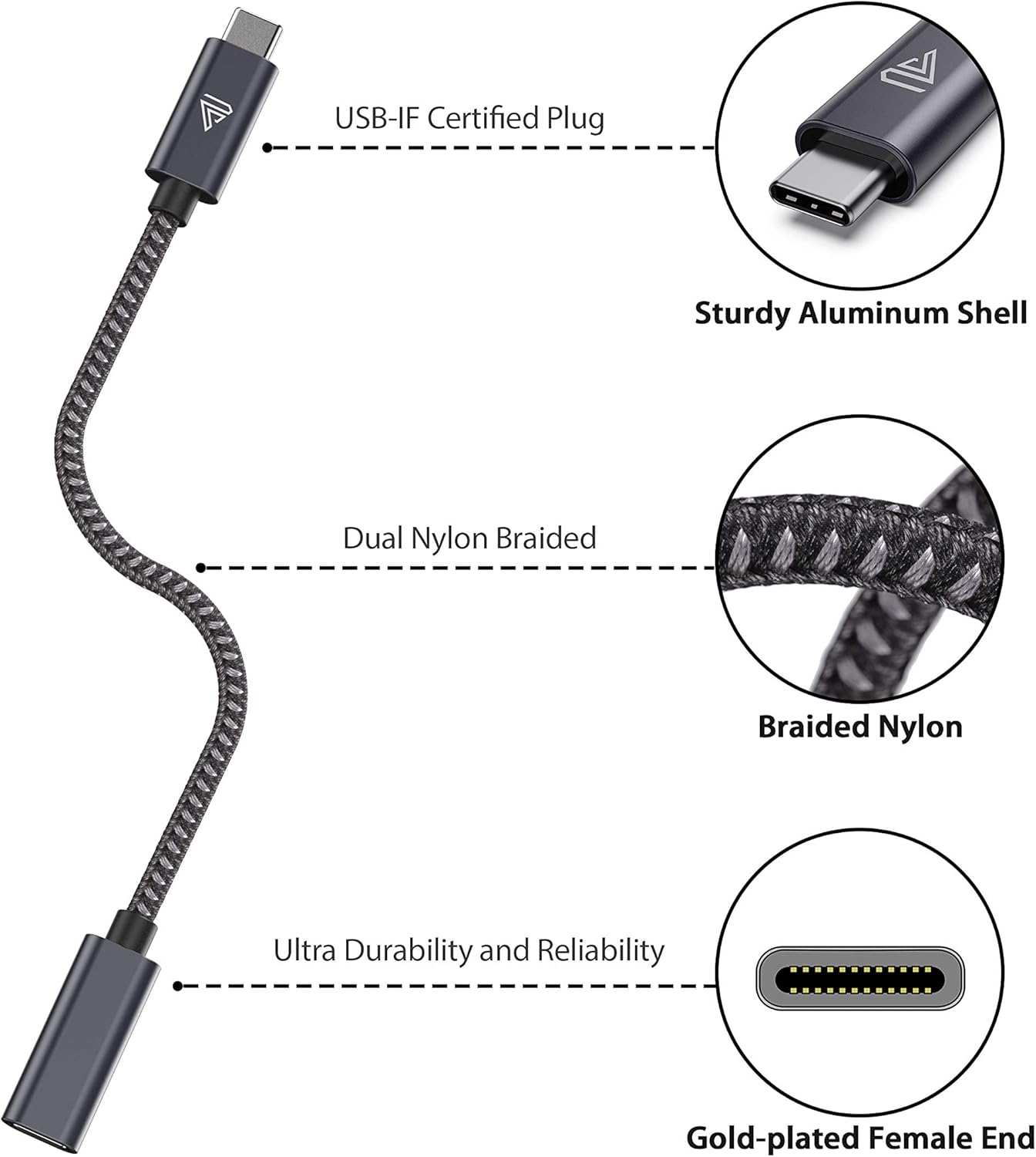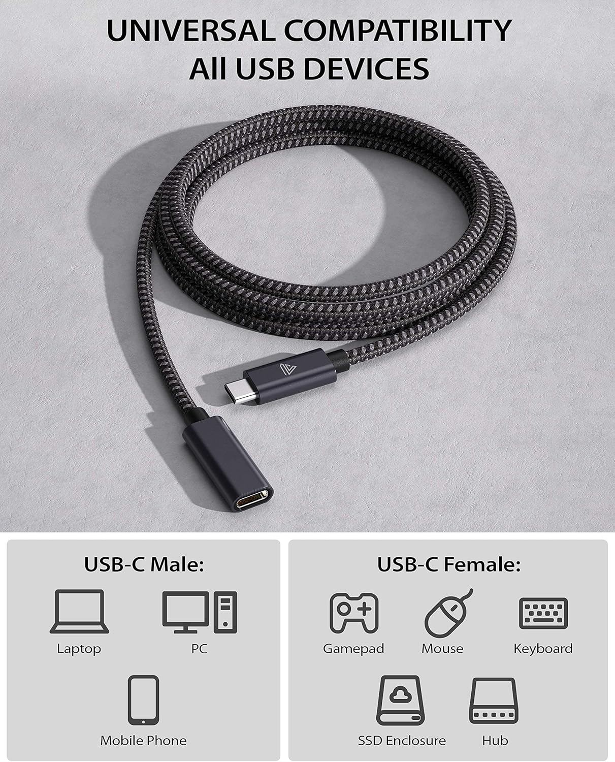 【Upgraded 20Gbps High-Speed Data Transfer】Faracent usb 3.2 type c data and charging Extension cable, which is used to extend the use distance of the type c interface. Our usb c extension cable provides super-fast data syncing at a maximum speed of 20Gbps, transferring an HD movie in just seconds. (NOTE: The transfer speed depends on the speed supported by your device port; Please use USB-C to C port to reach 20Gbps speed.) 【240W Ultra-Fast Charging】Faracent usb c extender cable supports 240W (48V/5A) fast charging function, bringing you the ultimate charging experience. Backward compatible with various power levels including 140W, 100W, 65W, and 30W. (Note: the charging power depends on the upper limit of your device.) 【4K@60Hz HD Video Output】Faracent usb type c extension cable supports up to 4K@60Hz resolution HD video output from USB C laptops to USB C display screen or monitor. Whether you are watching home movies or playing games, it can bring you a great experience! 【Durable and Flexible】Faracent usb c extension cord made of dual-layered nylon braided, providing exceptional durability and flexibility. Aluminum alloy connectors can withstand wear and tear better, enhancing the cable's lifespan. 【Compatible with Most USB C built-in devices】For usb-c devices/CF/SD/TF card reader and mutil-port USB hub/dock, iPhone 16 15, PSVR2, Mag Safe Wireless Charger, MacBook air M3 /M2/ M1 Mac mini, iPad Mini, Chromebook Pixel, Nexus 5X 6P, Lumia 950 950XL .(*Note: This cable not work with any thunderbolt 3 docking/hub/cable, Most Dell docking station is based on the thunderbolt 3 input. So this extender cable is not compatible, for example : Dell TB15,16 thunderbolt 3 docking station and the Belkin thunderbolt 3 dock,HP thunderbolt 3 dock, Oculus Quest Link ). Product Description 1 For Switch 2 For VR 3 For USB HUB Troubleshooting Step: 1)We don‘t recommend using our extension cable to connect multi-interface hubs as it may cause incompatibility or failure to work. 2)Video transmission will be unstable due to video signal attenuation from the connector. We suggest a total length within 10ft for both your usb c HDMI cable and this extension cable to achieve best charging and 4k video performance. If it exceeds 3 meters, instability or inability to use may occur. 3)Our extension cable is the charging speed of PD 240W . If you uses a low wattage charging cable, the charging speed will decrease. 4)Our extension cable incompatible All Dell Thunderbolt Dock / Hub / Base, e.g. Dell Business Thunderbolt Dock TB16 with 240W Adapter. 5)Our product can charge iPad, but it can't be used to connect USB C to 3.5mm audio cable for iPad. 6)We don't recommend using the device while charging, as it will easily generate heat, or the interface will shake loose during use, which will affect the normal charging. 7)If there is the problem when connected with your mouse, keyboard or printer (USB 2.0 devices), please reverse the female connector (receptacle) of the usb c extension cable.
