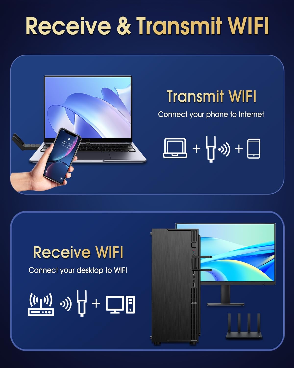 Super-Fast Wifi USB Adapter Basic Usage Scenarios Experience the latest Wifi technology with a USB3.0 Wifi adapter for desktop PCs, delivering high-speed AC 1300Mbps transmission, long-range, lag-free, and stable Wifi connections. Whether you're participating in real-time meetings, streaming your favorite shows, or playing games, you can enjoy seamless connectivity without any interference. Product Features *1.Widely Compatible* The USB WiFi Dual-Band Network Adapter supports Windows 11/10/8.1/8/7. Only Windows 11/10 can be used without the driver, while other systems can easily install the driver through our instructions. *2.Dual-band 5GHz and 2GHz bands* Supports dual frequency seamless switching, ensuring high-speed performance during use. The Wifi speed can be up to 867Mbps on the 5GHz band or 400Mbps on the 2.4GHz band, ideal for online gaming and HD video. *3.Soft AP Mode and Advanced Security* The USB WiFi dongle turns a wired internet connection to a PC or Laptop into a Wi-Fi hotspot. It employs the latest WPA3/WPA2/WEP security protocols to prevent others from stealing your network and avoid information leakage. *4.High Gain Dual Antennas* The USB Wifi adapter comes with 2 high gain long range 5dBi dual band antennas. Even if the signal is weak, this 5dBi high gain WiFi remote antenna can connect to the network, greatly improving the signal strength of the USB adapter for reception and transmission. *5.Super Speed USB 3.0* The USB 3.0 Wifi dongle offers up to 10 times faster transfer speeds compared to USB 2.0. Enjoy quicker response times during data transfers, smooth video streaming, and online gaming. đăSuper-Fast Wifi AdapterăExperience the latest Wifi technology with USB3.0 Wifi adapter for desktop pc, delivering high-speed AC 1300Mbps transmission, long-range and lag-free and stable Wifi connections. Whether you're participating in real-time meetings, streaming your favorite shows, or playing games, you can enjoy seamless connectivity without any interference. đăWidely Compatibleă USB WiFi Dual-Band Network Adapter can support Windows 11/10/8.1/8/7. Only Windows 11/10 can be used without the driver, other systems can easily install the driver through our instructions. đăDual-band 5GHz and 2GHz bandsă Support dual frequency seamless switching, as far as possible in the process of use has been in high speed state. the Wifi speed can be up to 867Mbps on 5GHz band or 400Mbps on 2.4GHz band for online gaming and HD video. đăHigh Gain Dual AntennasăUSB Wifi adapter with 2 high gain long range 5dBi dual band antennas can help you. Even if the signal is weak, this 5dBi high gain WiFi remote antenna can also be connected to the network, greatly improving the signal strength of the USB adapter for reception and transmission. đăSuper Speed USB 3.0ăUSB 3.0 Wifi dongle offers up to 10 times faster transfer speeds compared to USB 2.0. Enjoy quicker response times during data transfers, smooth video streaming, and online gaming.