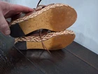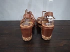 Pre-owned, in good condition. ***The inner lining of the sandals are cracking/peeling. Please note this in pictures. Size 7M These brown leather wedge sandals are highlighted by a basket weave wedge heel and has gladiator laces. 3.5" heel