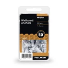 Product details Hillman Anchors are a one-piece, self-drilling anchor designed for use in hollow gypsum wallboard. The anchors are for light to medium duty loads. It is ideal for mounting electrical fixtures, fastening drapery supports. The anchors are also ideal for installing phone systems, and miscellaneous hardware. The drywall anchors feature a shark's-tooth design to provide correct positioning and quick installation. The anchors have a working load limit of 50 pounds. The nylon #6 wallboard anchors feature a white color and come with a set of 20. The Hillman anchor screws require no pre-drilling and feature a self-piercing point that eliminates the need for a pilot hole The easy to use anchors permit screw adjustments without loosening The user-friendly design allows for easy installation - just hammer into the material and tighten with a Phillips bit The anchors have a working load limit of 50 pounds The nylon #6 wallboard anchors feature a white color and come with a set of 20