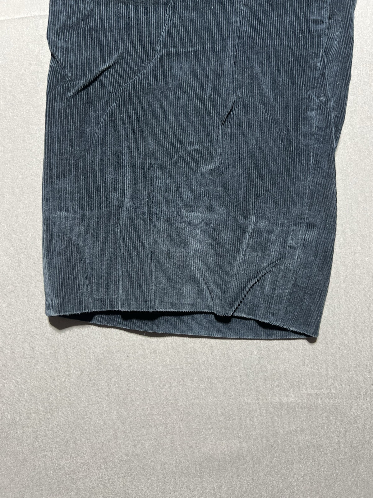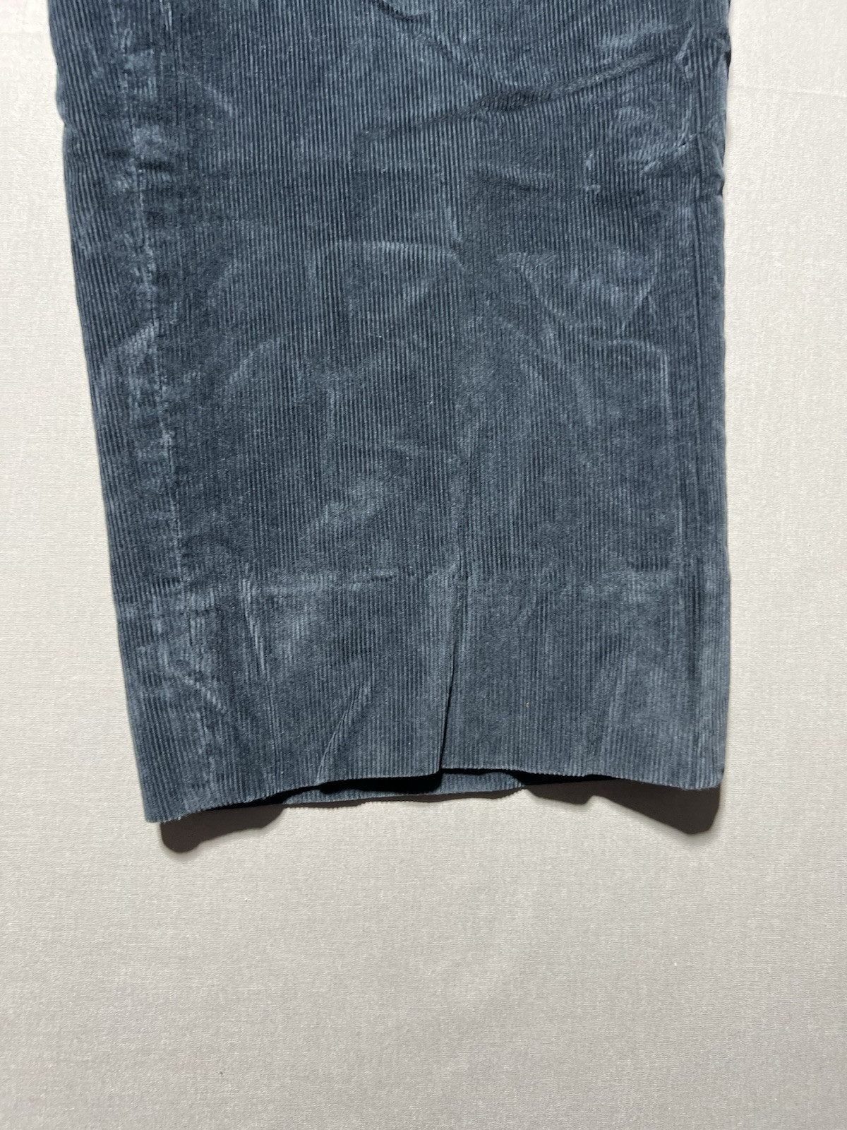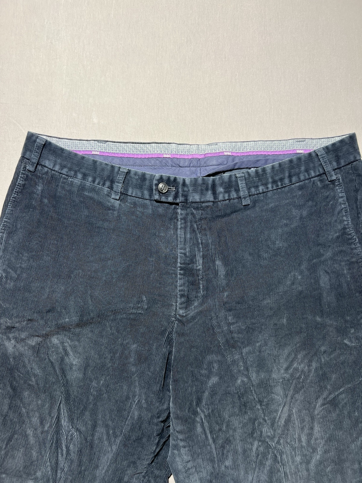 Men's navy blue corduroy pants by Hiltl for Carlo Bonomi in size 40. These casual pants feature a flat front, straight leg, and a mid-rise fit. Made from a cotton blend fabric, they have a zip and button closure, slash pockets, and a 27-inch inseam. Suitable for travel, workwear, or casual occasions in winter, summer, or spring. Easy care and machine washable.