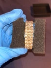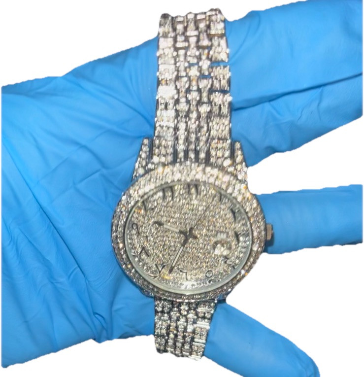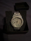 New never worn, Brand new in box Fully iced out diamonds , with calendar Selling cheap. Splash proof only since it is a custom item and low budget watch. Don’t take it swimming. Might resist water from watching your hands. But that don’t mean you should take it swimming Wash with a light damp cloth or brush avoid popping out one of the diamonds. Not for sweaty days #watch