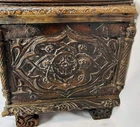 Historic Italian Carved Wooden Chest | Circa 16th–17th Century Historical Context & Origin Region: Northern Italy, Renaissance EuropeMaterial: Hand-carved hardwood with early wrought-iron lockworkPeriod: Circa 1550–1650 CE Description This exceptional Renaissance cassone—also known as a forziere or valuables chest—exemplifies the artistic craftsmanship of Northern Italy during the late Renaissance to early Baroque period. Carved from dense hardwood and richly decorated on all sides, it features deeply sculpted figural panels framed by flowing foliate scrolls and classical motifs. The lid presents an intricate narrative tableau within a quatrefoil-style border, while the front and sides display additional relief scenes including animals, draped figures, and architectural elements. Resting on carved scroll feet and fitted with an early wrought-iron internal lock mechanism, this chest would originally have served as a dowry chest, ceremonial strongbox, or household repository for treasured possessions. The interior retains its original compartmented structure, including a traditional side till. A warm, aged patina with traces of its original finish highlights centuries of preservation and continuous history. Features - Finely hand-carved Renaissance figural and foliate panels - Early wrought-iron hinges and internal locking mechanism - Original compartmented interior with traditional side till - Carved scroll feet and decorative Renaissance borderwork - Deep, warm patina consistent with 16th–17th century craftsmanship - A museum-worthy example of Italian domestic art and dowry tradition Cultural Significance Renaissance cassoni were central to Italian households and wedding traditions, often presented as marriage chests symbolizing prosperity, lineage, cultural refinement, and the formation of a new household. Their sculptural reliefs frequently depicted mythological, pastoral, or moral narratives, reflecting Renaissance values and artistic sophistication. Beyond symbolism, they functioned as secure strongboxes for textiles, jewelry, documents, and family heirlooms. Today, surviving examples like this provide invaluable insight into Renaissance domestic life, craftsmanship, and cultural identity—bridging fine art and functional design. Condition Very good antique condition with age-appropriate wear. Surface displays patina, handling marks, and minor abrasions to carved panels. Expected shrinkage and oxidation to iron fittings present. Scroll feet show historical restoration, typical and appropriate for cassoni of this age. Interior remains original with no modern reconstruction. Structurally sound and suitable for display. Dimensions (Approximate) Width: 28.25 inHeight: 16.5 in Age Approximately 375–475 years old Learn More Learn about Renaissance Italian woodcarving traditions and master craftsmen: Painters & Woodcarvers in Early Renaissance Italy Explore more authentic 17th-century historical artifacts from our collection: 17th Century Artifacts — Relic & Rarity Historic Italian Carved Wooden Chest | Circa 16th–17th Century Historical Context & Origin Region: Northern Italy, Renaissance Europe Material: Hand-carved hardwood with early wrought-iron lockwork Period: Circa 1550–1650 CE Description This exceptional Renaissance cassone—also known as a forziere or valuables chest—exemplifies the artistic craftsmanship of Northern Italy during the late Renaissance to early Baroque period. Carved from dense hardwood and richly decorated on all sides, it features deeply sculpted figural panels framed by flowing foliate scrolls and classical motifs. The lid presents an intricate narrative tableau within a quatrefoil-style border, while the front and sides display additional relief scenes including animals, draped figures, and architectural elements. Resting on carved scroll feet and fitted with an early wrought-iron internal lock mechanism, this chest would originally have served as a dowry chest, ceremonial strongbox, or household repository for treasured possessions. The interior retains its original compartmented structure, including a traditional side till. A warm, aged patina with traces of its original finish highlights centuries of preservation and continuous history. Features - Finely hand-carved Renaissance figural and foliate panels - Early wrought-iron hinges and internal locking mechanism - Original compartmented interior with traditional side till - Carved scroll feet and decorative Renaissance borderwork - Deep, warm patina consistent with 16th–17th century craftsmanship - A museum-worthy example of Italian domestic art and dowry tradition Cultural Significance Renaissance cassoni were central to Italian households and wedding traditions, often presented as marriage chests symbolizing prosperity, lineage, cultural refinement, and the formation of a new household. Their sculptural reliefs frequently depicted mythological, pastoral, or moral narratives, reflecting Renaissance values and artistic sophistication. Beyond symbolism, they functioned as secure strongboxes for textiles, jewelry, documents, and family heirlooms. Today, surviving examples like this provide invaluable insight into Renaissance domestic life, craftsmanship, and cultural identity—bridging fine art and functional design. Condition Very good antique condition with age-appropriate wear. Surface displays patina, handling marks, and minor abrasions to carved panels. Expected shrinkage and oxidation to iron fittings present. Scroll feet show historical restoration, typical and appropriate for cassoni of this age. Interior remains original with no modern reconstruction. Structurally sound and suitable for display. Dimensions (Approximate) Width: 28.25 in Height: 16.5 in Age Approximately 375–475 years old Learn More Learn about Renaissance Italian woodcarving traditions and master craftsmen: Painters & Woodcarvers in Early Renaissance Italy Explore more authentic 17th-century historical artifa