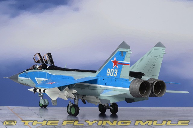 Hobby Master 1:72 Air Power Series HA9706 Mikoyan MiG-31E Foxhound-A Diecast Model Russian Air Force, White 903, Zhukovsky International Airport, Russia, MAKS Airshow 2005 Limited Edition 1:72 Scale Length Width Mikoyan MiG-31E Foxhound-A 12.5" 7.25" The MiG-31E is an export version of the Foxhound-A, of which the one and only prototype (serial 903) was first seen in 1997. The aircraft has downgraded systems, no active jammer, downgraded IFF and radar. It was offered to India, China and other countries and is presumably the version the Chinese almost bought in 1992. The variant was later cancelled. Mikoyan MiG-31E Foxhound-A Designed as an enhanced version of the MiG-25, the MiG-31 was first flown on September 16th, 1975. © Copyright 2003-2026 The Flying Mule, Inc. Hobby Master 1:72 Air Power Series The Hobby Master "1:72 Air Power Series" range presents detailed, ready-made diecast models of military aircraft. Hobby Master "1:72 Air Power Series" diecast airplanes feature: Diecast metal construction with some plastic components. Realistic panel lines, antennas, access panels and surface details. Pad printed markings and placards that won't fade or peel like decals. Presentation stand to display the aircraft "in flight". Accurately detailed underside with concealed screwheads. © Copyright 2003-2026 The Flying Mule, Inc.