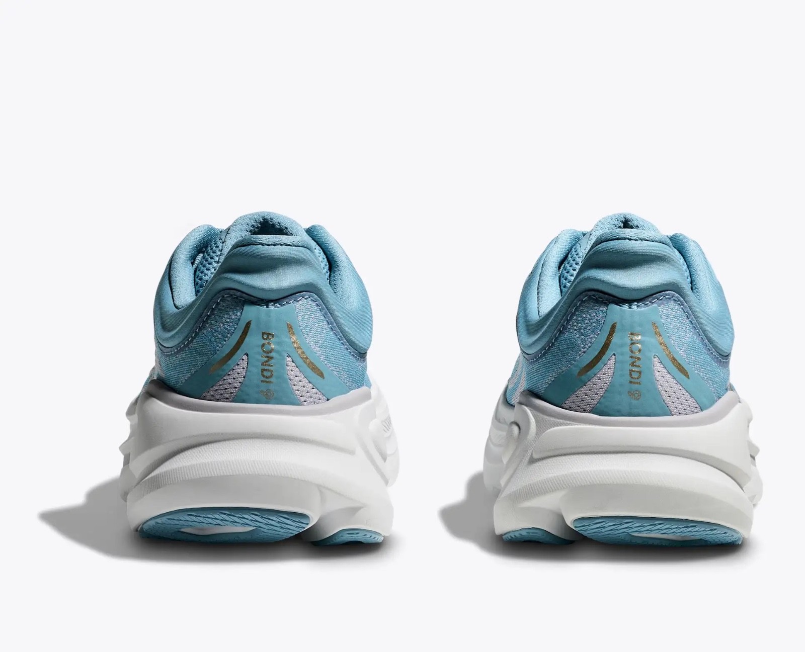 The Hoka One One Bondi 9 Women's Running Shoes in size 11B feature a stylish blue, grey, and white colorway with a lace-up closure and a low top shaft style. Made with a breathable mesh upper and a comfortable rubber outsole, these athletic shoes are perfect for running and jogging. The Hoka One One Bondi 9s are designed for active women looking for a supportive and stylish sneaker for their workouts or casual wear.