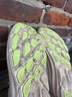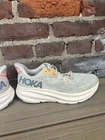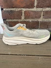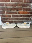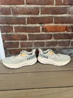 The Hoka One One Clifton 9 1127896 VLS Beige Running Shoes Sneaker in women's size 10B are a stylish and comfortable option for casual wear. These lace-up sneakers feature a solid beige color with logo accents, making them versatile for various occasions. The rubber outsole provides traction, while the cushioned and breathable design offers comfort and performance. Ideal for gym training, walking, running, and more, these athletic shoes from the Hoka One One Clifton series are designed for all seasons and feature a low-top shoe shaft style. Bottoms stay grippy but some tread has become flat.