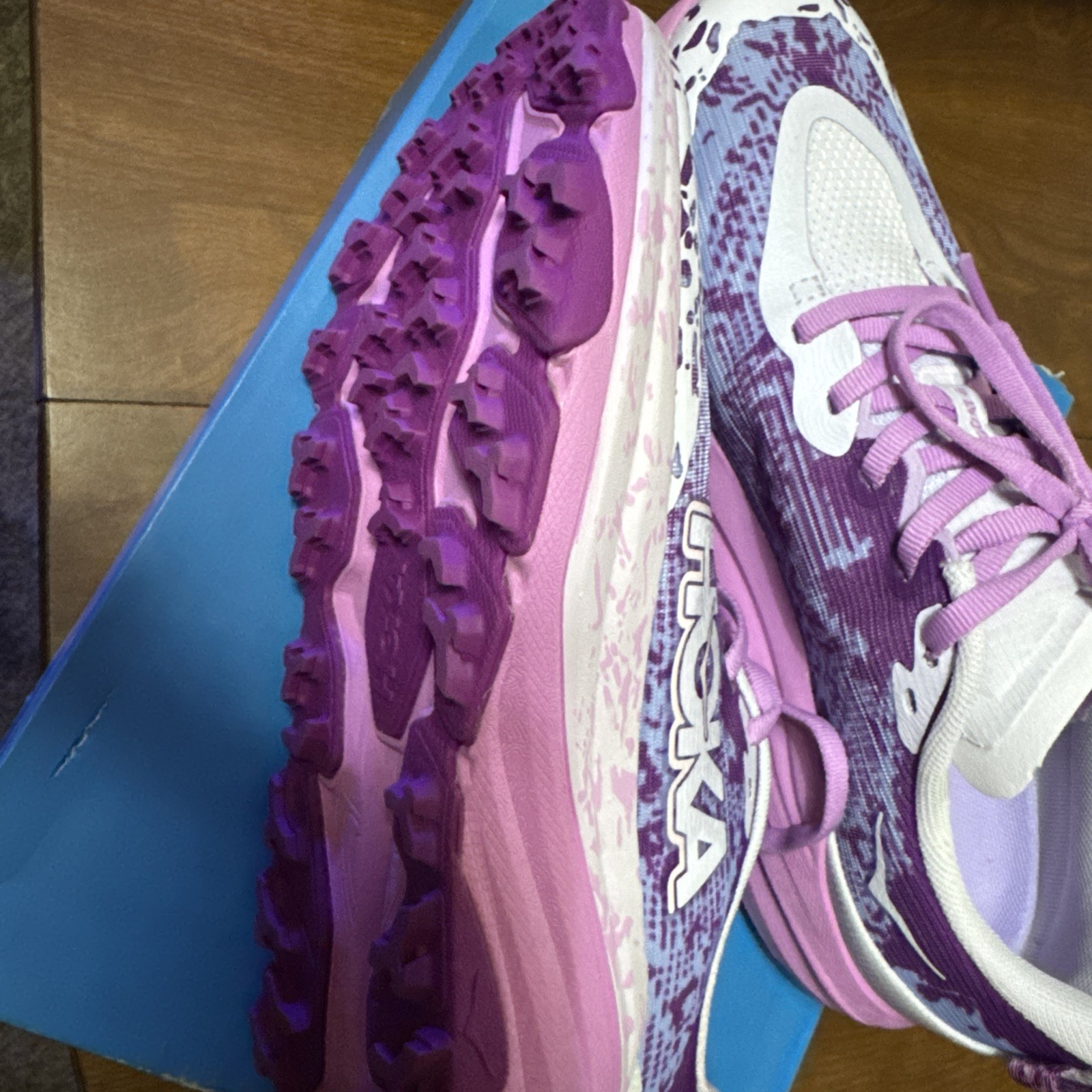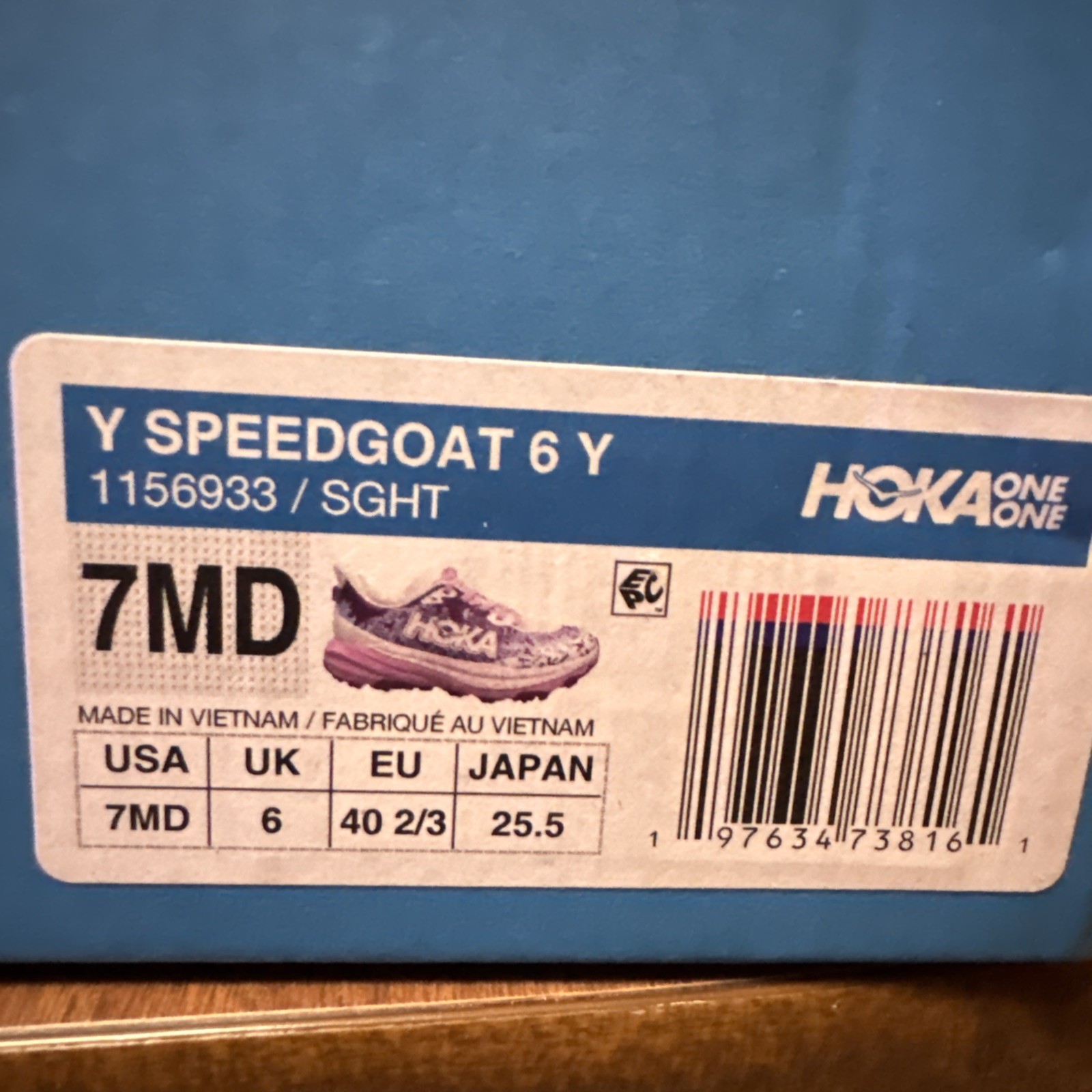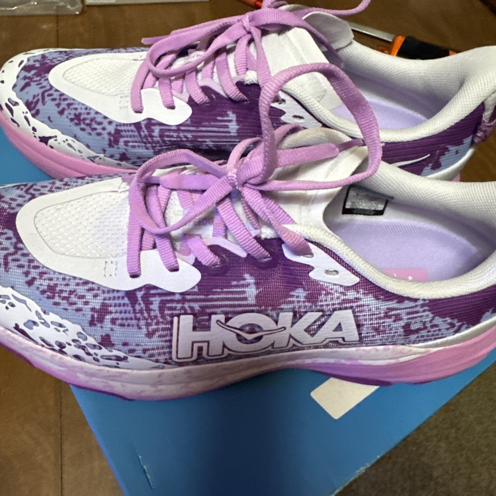 The product is a brand new pair of Hoka One One shoes, specifically the Men's 7 and Women's 8 1/2 sizes. These athletic sneakers feature a low top shaft style with a lace-up closure, solid multicolor design, and a rubber outsole for added durability. Ideal for activewear or casual occasions, these sneakers are designed for overpronation and come with a foam insole for added comfort. The Hoka One One Speedgoat model is known for its performance and style, making it a great option for summer, fall, and spring seasons. Plus, with free shipping included, these shoes are a convenient and stylish choice for avid athletes and casual wearers alike. BRAND NEW WITH BOX!!