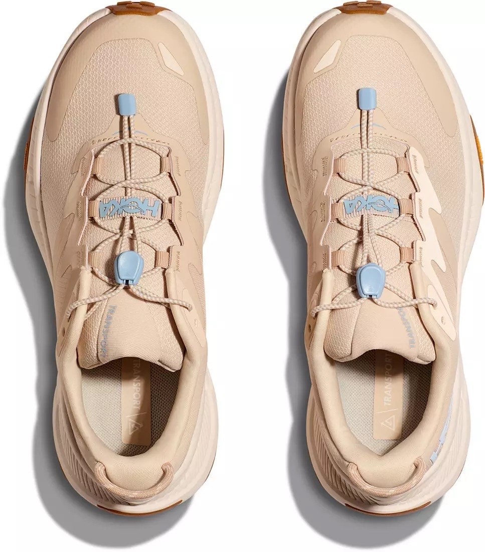 The Hoka One One Transport Trail Women's Running Shoes in size 7B are a tan and white sneakers with a low top shoe shaft style and lace-up closure. They are designed for athletic use, suitable for both activewear and casual occasions. The mesh fabric type and synthetic lining material provide breathability, while the rubber outsole offers durability for various terrains. Featuring the Hoka One One logo accents, these sneakers are part of the Transport product line, known for their comfort and performance in both running and everyday wear.