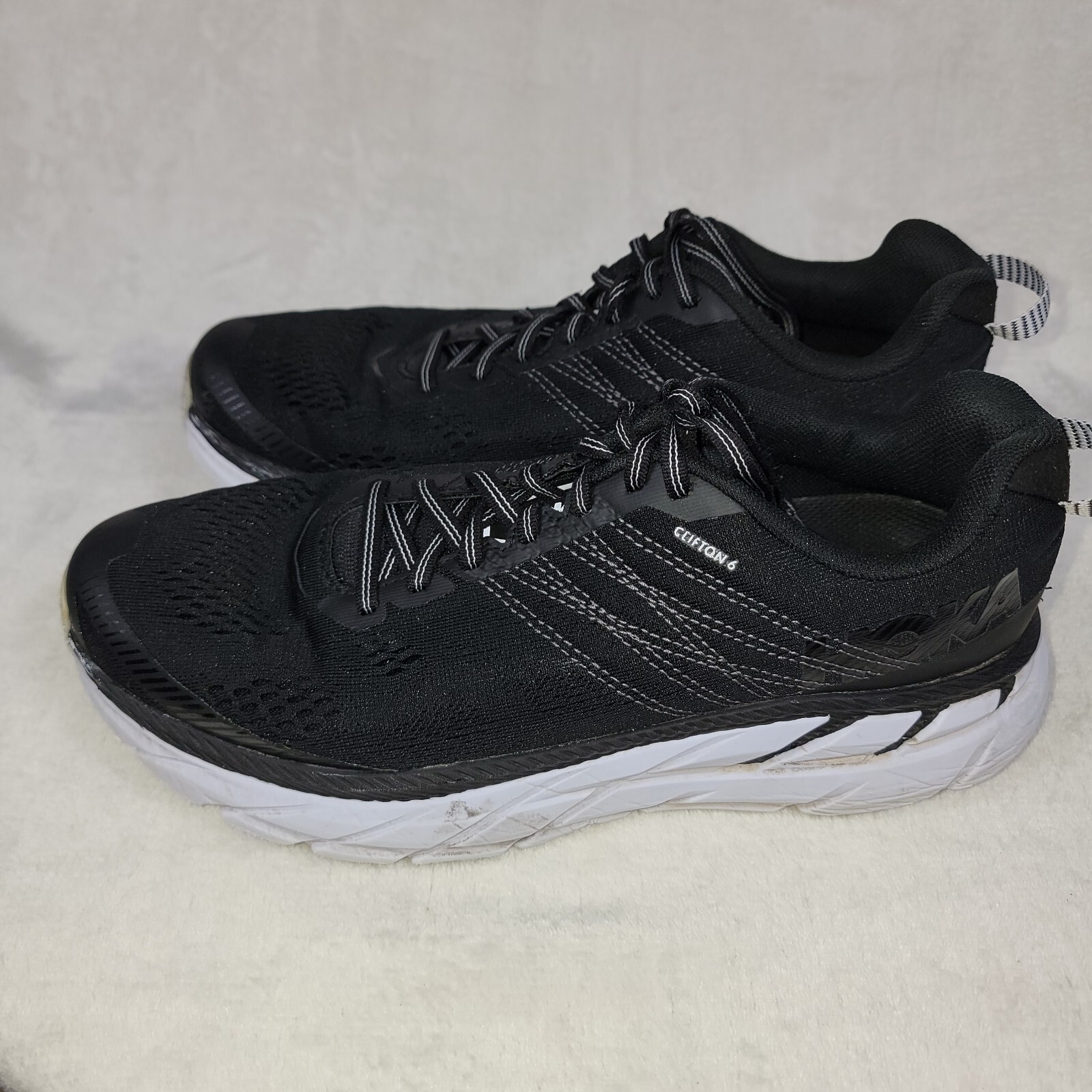Hoka One Womens Black Clifton 6 size 8.5. Slight Wear on the bottom. Shoe is clean overall and as shown in the photo still in great shape. Please see photos for color, style, condition. This is the exact item you will purchase. Fast Shipping Thank you for looking