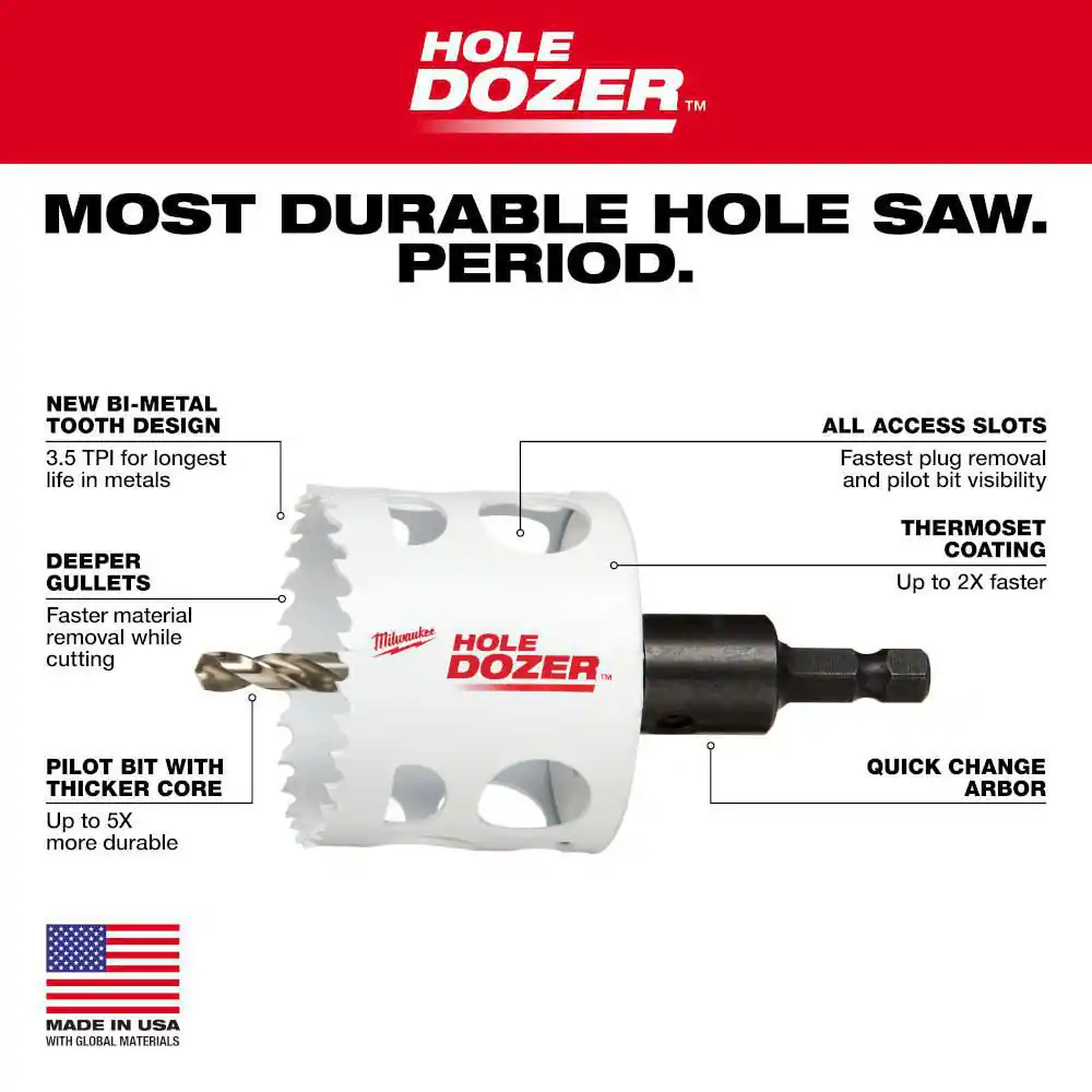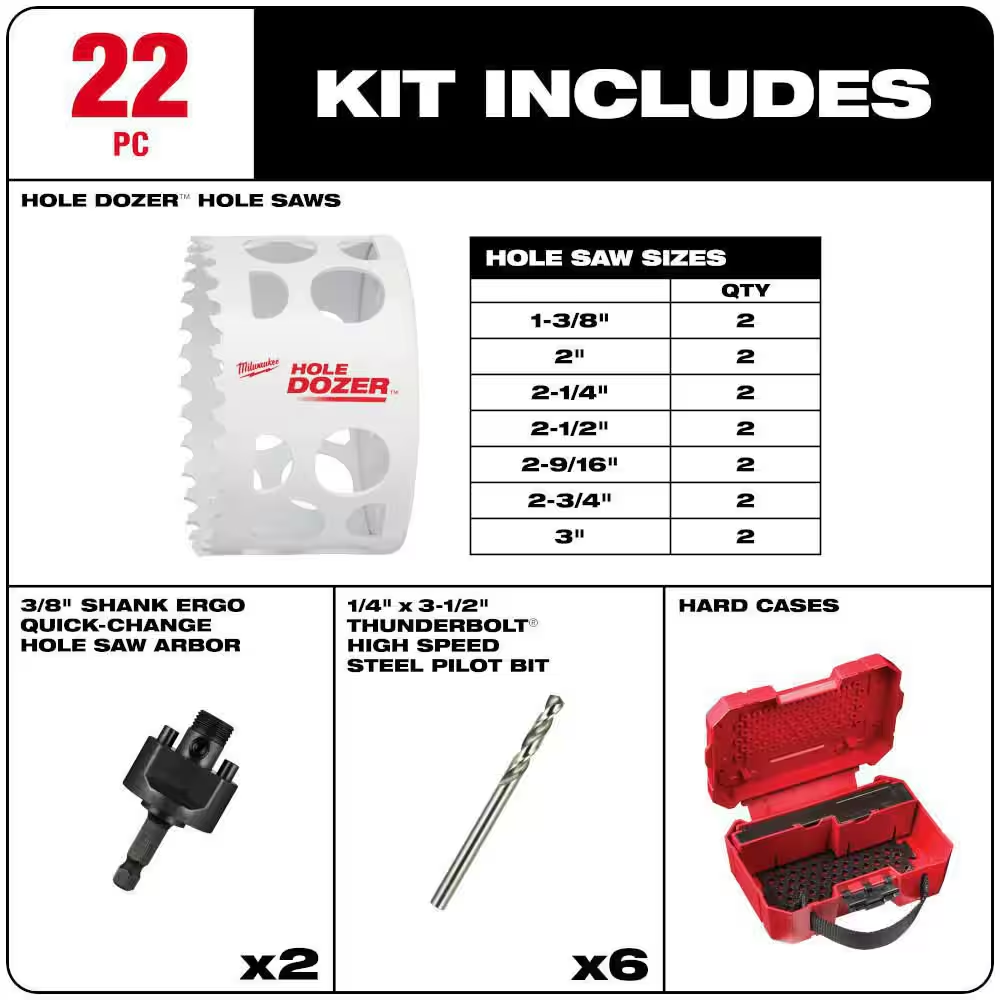 Fast Shipping On All Items 30 Days Money Guarantee Customer Support Excellent Service 100% Satisfaction Satisfaction Guaranteed Hole Dozer General Purpose Bi-Metal Hole Saw Set (22-Piece) Specification Arbor included Yes Bit Material Bi-Metal Drill Bit Type Hole Saw Drill Bit Type(s) Included Bit Extender/ Holder,Brad/Pilot Point,Hole Saw Individual/Set Set Material Cut Multi-Purpose Min Chuck Size Required 3/8 In. Number of Pieces 21-30 Pieces Pilot Bit Included Yes Returnable 90-Day Shank Style Hex Teeth Per Inch 4/5 Tools Product Type Power Tool Drilling Depth (in) 1.8 Product Depth (in) 8 in Product Height (in) 3 in Product Width (in) 5.5 in 5.5 inches x 8.0 inches x 3.0 inches. Item Description Most Durable Hole Saw. Period. New 3.5 TPI Tooth Design Customizable Hole Saw Case The Milwaukee General Purpose 22-Piece HOLE DOZER Bi-Metal Hole Saw Kit features a new 3.5 TPI tooth design that offers users the longest life in metal applications. These HOLE DOZER Bi-Metal Hole Saws feature the industry's only Lifetime Tooth Break Warranty and can take on all general purpose applications, making them the most durable hole saws. Our ALL-ACCESS SLOTS solve the frustration of plug removal, making users more productive with less downtime between holes. The new slot design also gives users increased pilot visibility for accurate placement and faster chip ejection keeping their cut cool. HOLE DOZER Thermoset Coating allows for faster cutting and is optimized for cordless tools, delivering users 25% more holes per charge. The included Milwaukee Hole Saw Case offers enhanced customization capability thanks to the interchangeable pegs. Store arbors, pilot bits and more in the removable accessory box or remove it to create more space for hole saw storage. Each Milwaukee Hole Saw Case boasts a reinforced grid design on both top and bottom plus heavy-duty latches, allowing for hole saws to be securely stored within this durable, hard case design. The Milwaukee Small Hole Saw Case fits conveniently in Milwaukee Packout Organizers making transportation and storage a breeze. All-access slots for easy plug removal Thermoset coating for faster cutting Interchangeable pegs allow for customizable kit configurations Reinforced grids on top and bottom keep hole saws securely stored Removable accessory box offers additional customization options Designed to fit perfectly into packout organizers Includes: (2) 1-3/8 in. HOLE DOZER Bi-metal hole saw (49-56-9615), (2) 2 in. HOLE DOZER Bi-metal hole saw (49-56-9624), (2) 2-1/4 in. HOLE DOZER Bi-metal hole saw (49-56-9628), (2) 2-1/2 in. HOLE DOZER Bi-metal hole saw (49-56-9631), (2) 2-9/16 in. HOLE DOZER Bi-metal hole saw (49-56-9632), (2) 2-3/4 in. HOLE DOZER Bi-metal hole saw (49-56-9635), (2) 3 in. HOLE DOZER Bi-metal hole saw (49-56-9637), (2) large thread arbor (49-56-7250), (6) pilot bit (49-56-8010) About us We offer the best prices around on high quality products. Our E-store includes media such as books, movies, music and games while offering electronics, toys, sporting apparel, clothing, tools, general home, garden items and more. Shipping We are always working hard to ensure your package arrives as soon as possible. Please understand that some factors like weather, high postal traffic, and the performance of shipping companies are outside of our control. We offer free shipping to the lower 48 states and ship within 2-3 business days of payment, usually sooner. We do not accept P.O. Boxes. Please provide a physical address. For shipping outside of the continental USA, we only use eBay's Global Shipping Program.The item is shipped to KY and then sent to the rest of the world. International customers are responsible for all duties and taxes. Continue to check out to calculate costs for shipping the item to your country. Messages regarding eBay's Global Shipping Program MUST be directed at eBay EXCLUSIVELY. Returns We offer a 30-Day Return Policy on items in which you are not completely satisfied with. You have the option of a full-refund or an exchange of the item. No returns are available on items shipped outside of the USA Satisfaction We try over very best to make sure every customer is completely satisfied. If there's a problem, message us! We're happy to help. Payment Options Shop With Confidence