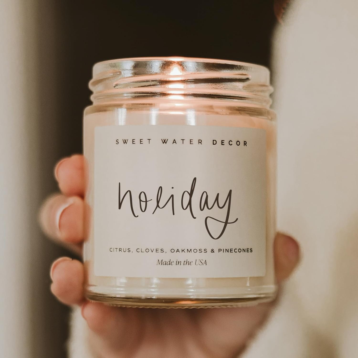 Sweet Water Decor Holiday Candle - Cloves, Pine, and Script Label, White Product Details Production Method: Our candles are made to be gluten, lead, and phthalate free with American grown soy wax blend. They are all poured in Pittsburgh, PA, USA. Size: Script Label Width: 2.75 inches Height: 2.75 inches Length: 3.5 inches Color: White Material: Soy Wax Blend Scent: Holiday Package Dimensions : 4.7 x 4.4 x 4.3 inches; 14.39 ounces SMELLS LIKE - Let citrus, cloves, black Dahlia petals, pinecones, oakmoss, Cassia Bark, and sandalwood fill your home this holiday season. This beautiful yet complex scent brings together the winter scents into one holiday scented candle. CANDLE INFO - 9oz Clear Candle Jar with Gold Lid | Jar Size: 2.5 x 2.5 x 3.5" | 204g Net Weight | 40+ Hour Burn Time CANDLE CARE - Trim your wick to 1/4" before candle is lit each time to prevent soot. Burn candle so wax pool reaches the jar edge each time to prevent wax tunneling. Burn candle no more than 4 hours at a time. Do not burn candle with less than a 1/2" of wax remaining. Keep candle away from fans, open windows, hot surfaces, children, pets. Never leave a burning candle unattended PERFECT GIFT - If you love this winter candle, share the love and give the perfect gift for mom, sister, co-worker, friend and everyone in between. If you need a Christmas gift, birthday gift or even housewarming gift, look no further. This cozy candle is a great stocking stuffer for candle lovers, too. STYLISH - Our soy Christmas candles are not only functional, but stylish! They can blend in with any home decor style from rustic, to modern, to farmhouse. They are the perfect home accessory that happen to be some of the best smelling scented candles!
