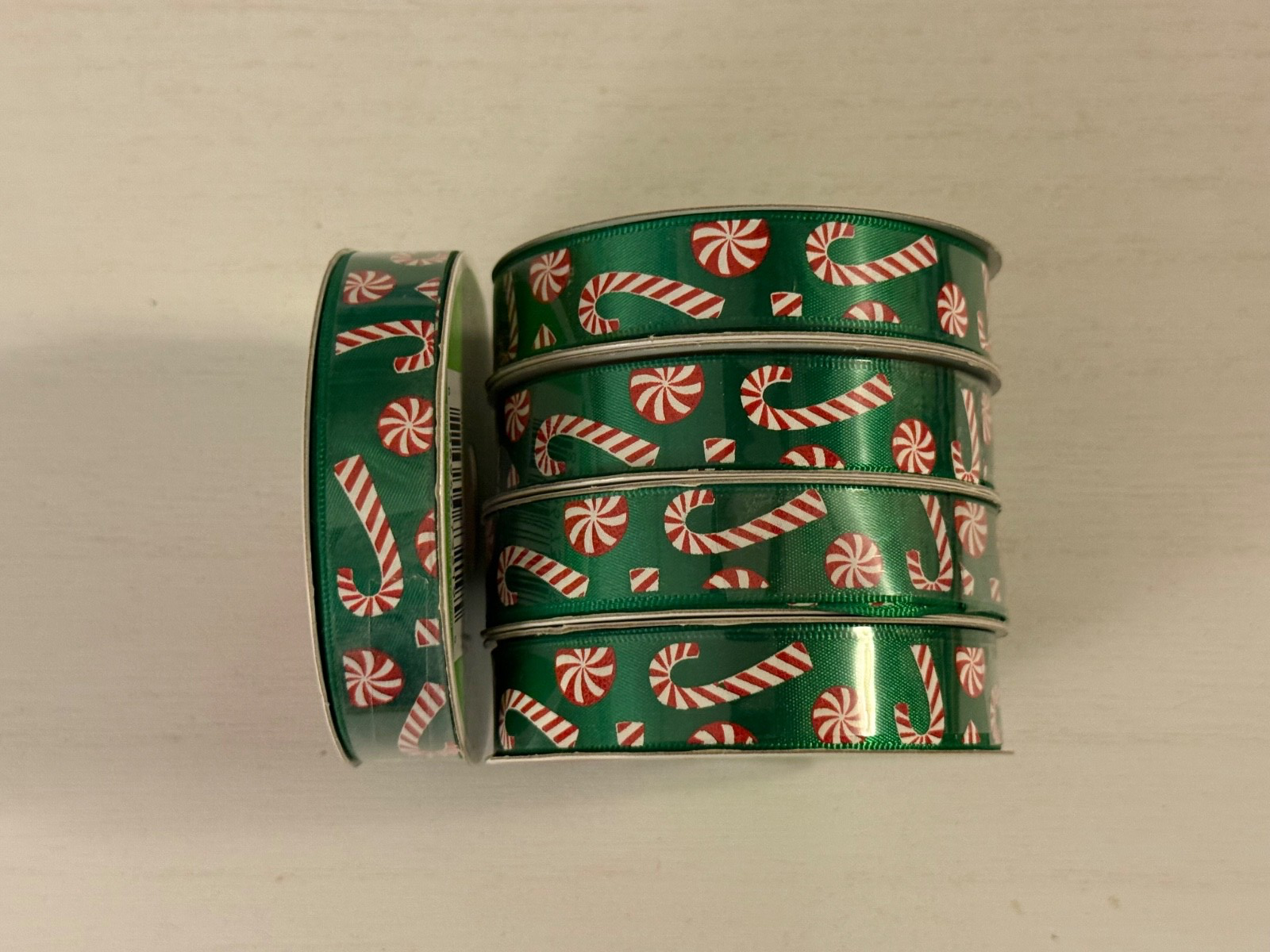 Celebrate it Green Ribbon with red and white candy canes on it This listing is $1.99 for each Spool of ribbon Size of ribbon on spool 5/8 in X 3 yd 15.8 mm X 2.7 Made of 100% polyester Made in Taiwan