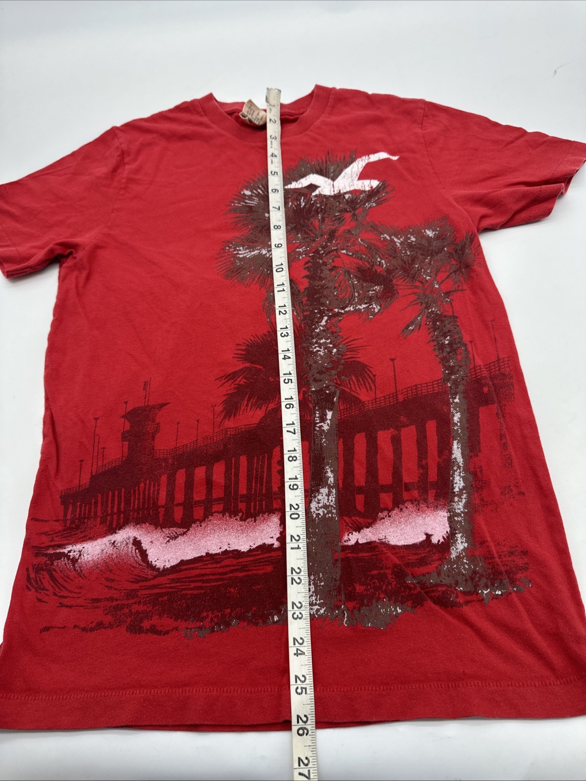 Elevate your casual style with this classic Hollister California T-shirt. Made of soft and comfortable cotton material, this short-sleeve crew neck t-shirt features a graphic print logo on the chest, adding a touch of style to your outfit. The t-shirt comes in a vibrant red color, perfect for all seasons, and is designed to fit a regular size M. With a timeless design, this t-shirt is perfect for any man who loves to show off his love for California. The t-shirt is made in Bolivia and is an ideal choice for the fall and spring seasons. Whether you're out for a casual day or running errands, this Hollister California T-shirt is a must-have addition to your wardrobe. Check pictures for flaws and measurements