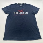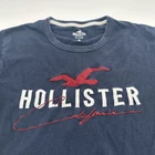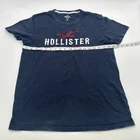 This is a men's Hollister California T-shirt in size M, featuring a blue color with a graphic print logo on the front. The shirt has a crew neck and short sleeves, made of cotton material with a relaxed fit. It is suitable for all seasons and includes a logo accent. The shirt is designed with a California theme and was manufactured in Vietnam. Check pictures for flaws and measurements