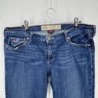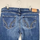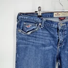 Brand: Hollister. Item: Teens/juniors low-rise stretch bootcut jeans in a medium wash blue denim. Size on tag: 11R; juniors sizing. Color: Medium wash blue with subtle fading and whiskering at the thighs and seat. Material: 98% cotton, 2% elastane stretch denim per interior fabric tag. Country of manufacture: Made in Guatemala. Design details: Low-rise waist with belt loops, zip fly with Hollister-logo button closure, and classic five-pocket construction including a coin pocket with embroidered seagull logo. Back details: Back patch pockets with curved contrast stitching and a leather Hollister Co. logo patch at the back waist. Branding and labels: Interior waistband label reads HOLLISTER CALIFORNIA with maroon STRETCH tab; interior care label lists style code 3X1384, SKU# 55074751, RN# 102573, vendor #70298, and code HWF0713. Style notes: Soft stretch denim bootcut silhouette designed for everyday casual wear for teens and juniors.