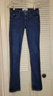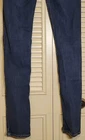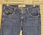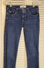 These Hollister jeans are in a size 5L with a slim fit, low rise, and skinny style. They are made of stretchy blue denim fabric with a 5-pocket design and a button and zip closure. The jeans feature a logo accent, have a waist size of 28 inches, and an inseam of 32½ inches. Designed for juniors, they offer comfort and are machine washable.