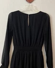 The Hollister Women's Large Black V-neck Knee-Length Layered Elastic-waist Dress is a stylish and comfortable option for a party or cocktail event. The dress features a flattering V-neckline, long puff sleeves with ruffle accents, and a pullover closure. Made from a blend of polyester and nylon, the dress is lined and designed with an elastic waist for a slimming and comfortable fit. The knee-length A-line silhouette and layered lacy style fabric add a touch of bohemian flair to the overall look. This dress from Hollister is sure to make a statement. Length: 35 inches. Chest: 18 inches across laying flat.
