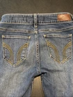 These Hollister Women's Cali Low Rise Denim Jeans in size 3 with a waist size 26 and inseam 30 offer a stylish and versatile option for any wardrobe. The bootcut style and distressed detailing add a trendy touch, while the cotton blend fabric ensures comfort and durability. Perfect for all seasons, these jeans are easy to care for with machine washable instructions. Pair them with your favorite top and shoes for a casual yet chic look that is perfect for everyday wear or special occasions.