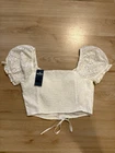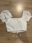 This Hollister Woman's White Eyelet Cropped Puff Sleeve Top Shirt in size Small is a stylish and versatile addition to any wardrobe. Made of comfortable cotton knit fabric, this blouse features a flattering off the shoulder neckline with ruffle accents, puff sleeves, and embroidered details. Perfect for both party and casual occasions, this lightweight and breathable top is easy to care for with machine washable instructions. The white color and solid pattern make it a classic piece that can be worn in the summer, fall, and spring seasons. Made in India, this top offers a regular fit and a trendy cropped style. Size small New with tags