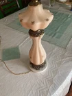 Beautiful Pink Etched Glass Table Lamp with Brass Scrollwork & Marble Base This exquisite table lamp features delicate pressed pink etched glass adorned with gold roses and white relief accents. The lamp is elegantly topped with brass scrollwork and rests on a genuine Carrara marble base. Standing at 23" tall (33" including the shade mount), this lamp’s timeless design and neutral colors make it an ideal addition to any room. **Key Features:** - **Height:** 23" (33" with shade mount) - **Base:** marble - **Design:** Pink etched glass with gold and white relief accents, brass scrollwork - **Condition:** Vintage, with some paint loss on the lamp’s body. The wiring appears to have been rewired in a Mid-Century style but should be checked and adapted to meet current safety codes. This lamp combines elegance with functionality and is perfect for adding a touch of sophistication to your home. **Shipping & Packaging:** The lamp will be carefully packaged and quickly shipped to ensure it arrives safely. Please take a close look at the pictures, and don’t hesitate to reach out if you have any questions .