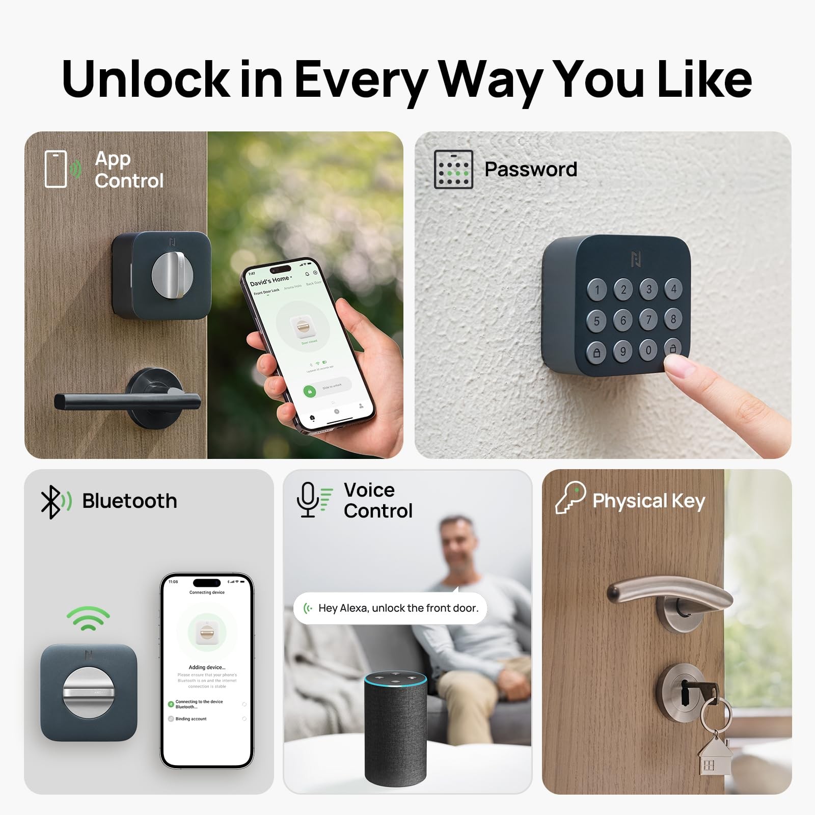 Holo Wi-Fi Smart Lock with Keypad, Keyless Entry Deadbolt Door Lock with App Remote Control, Auto-Lock & Anomaly Detection, Non-Destructive Installation, Supports Alexa, Apple Home, Matter 【NO-HUB Matter Ecosystems Support】Holo Smart door lock is compatible with third-party ecosystems like Alexa, Apple HomeKit. Paired with these smart devices, you can easily control your door locks using voice commands, facilitating seamless connectivity within smart home 【Upgrade Your Deadbolts with Easily Installation】Holo wifi deadbolt smart locks are compatible with most single-cylinder deadbolts. It can be easily installed on the inside of the door with just a screwdriver, simply making your regular door lock smarter, safer and more convenient 【Auto-Lock & Anomaly Detection】Never have to worry about whether you've locked your door or not. Holo's built-in inertial sensor can detect closed door status and locks automatically. An alarm will be issued via buzzer or App notification when the lock is jammed or left open for a long time, providing peace of mind knowing you have always secured your home 【Durable Battery Life】Holo wifi smart deadbolt lock requires only 4 AA batteries to last 4-6 months in standard Wi-Fi mode which includes features such as remote control and real-time security alerts. You can also turn on the low power mode when travelling to extend the usage time 【Personalized Management】No more leaving keys under the doormat. You can share full home entry with family and trusted friends, or use front door smart lock create temporary or one-time passcodes for guests like dog walkers or babysitters, all from the convenience of App
